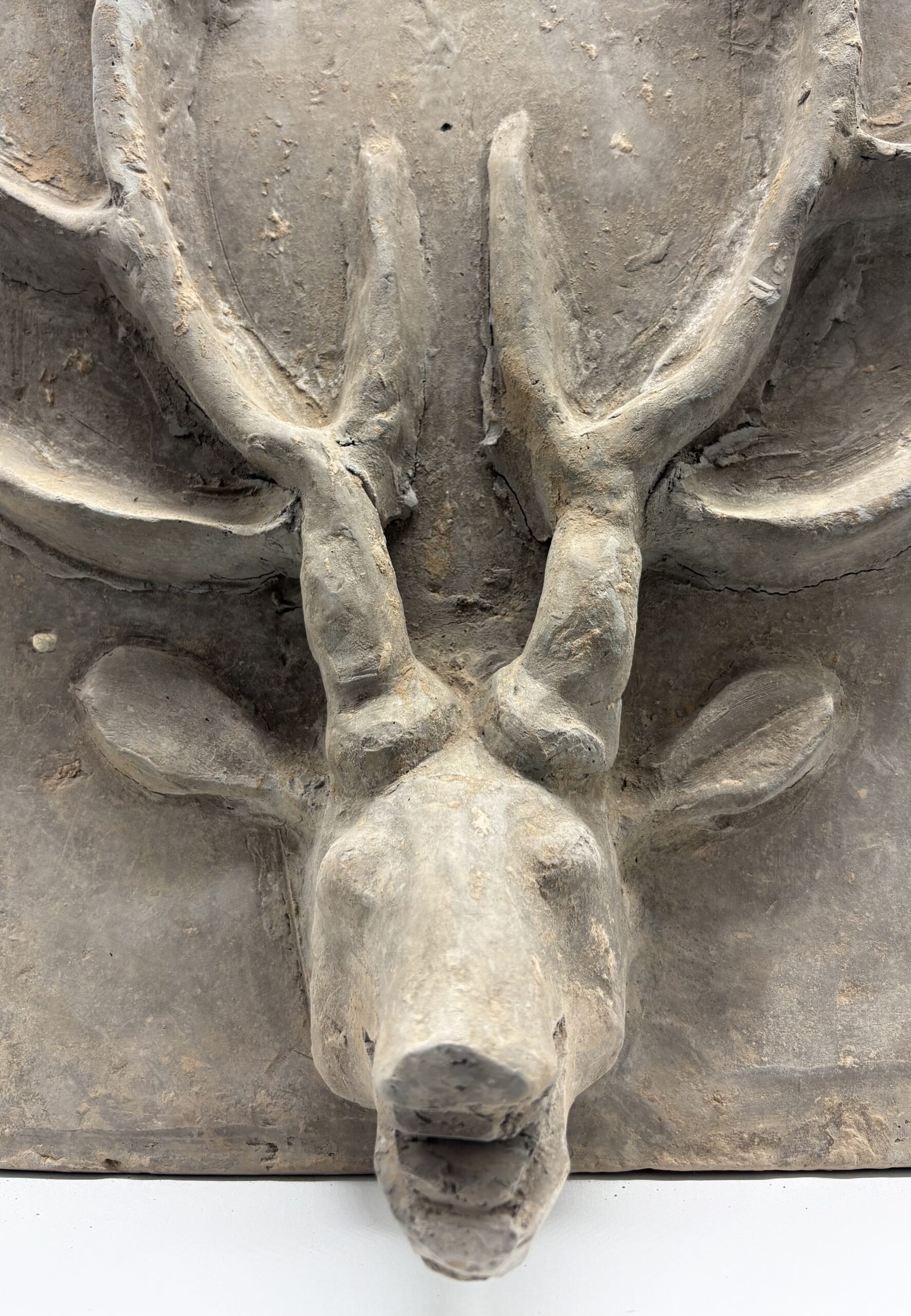 Imposante brique sculptée en terre cuite qui s’inscrit dans le corpus des éléments architecturaux funéraires de la dynastie Han, période marquée par une codification symbolique forte de l’au-delà et par l’essor d’un art funéraire narratif et protecteur. La composition, organisée autour d’un grand cervidé en relief central, se développe sur une brique rectangulaire épaisse, aux proportions monumentales. Le cerf est représenté de face, la tête surgissant puissamment hors du plan de la plaque, créant un effet de saillie presque sculptural en ronde-bosse. Les bois, largement déployés et traités de manière stylisée, structurent l’espace supérieur et latéral, occupant presque toute la surface, tandis que les pattes antérieures sont suggérées en léger relief, conférant à l’animal une posture à la fois hiératique et dynamique. Au-dessus de l’animal apparaît un petit quadrupède secondaire, traité de manière schématique, probablement un chien ou un animal domestique, élément fréquent dans l’iconographie funéraire Han, évoquant la garde, la vigilance ou l’accompagnement de l’âme. Les formes sont volontairement simplifiées, privilégiant l’impact symbolique à la précision naturaliste. Le revers, entièrement lisse et non décoré, présente des traces nettes de façonnage, avec stries verticales et irrégularités témoignant d’un moulage ou d’un travail à la plaque, caractéristique des productions architecturales funéraires destinées à être intégrées dans des structures murales ou des chambres sépulcrales. La perforation rectangulaire visible sur la face supérieure suggère un système d’ancrage ou d’emboîtement, confirmant la fonction architecturale de l’objet, probablement intégré à un ensemble plus vaste tel qu’un mur de tombe, un pilier ou un dispositif symbolique de seuil.