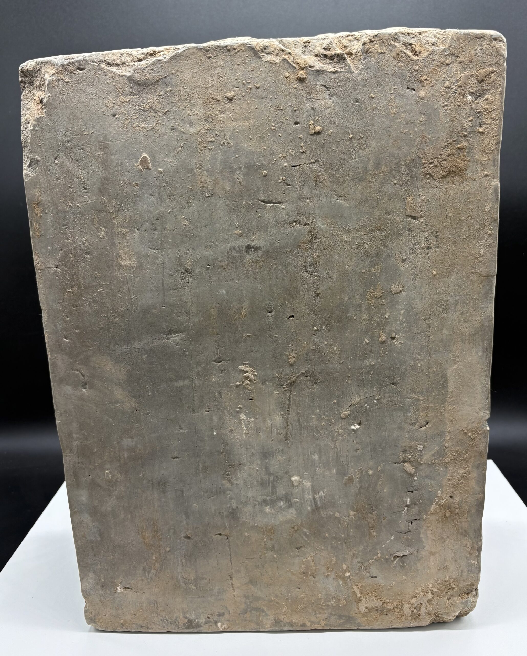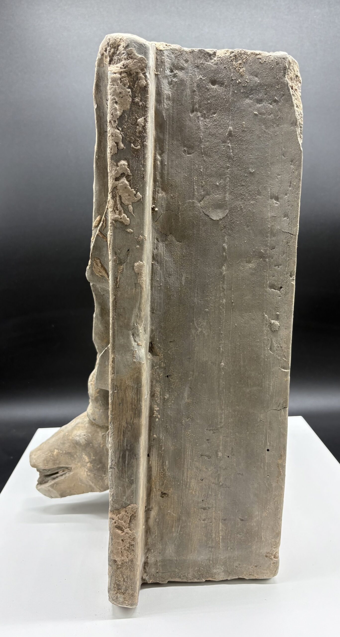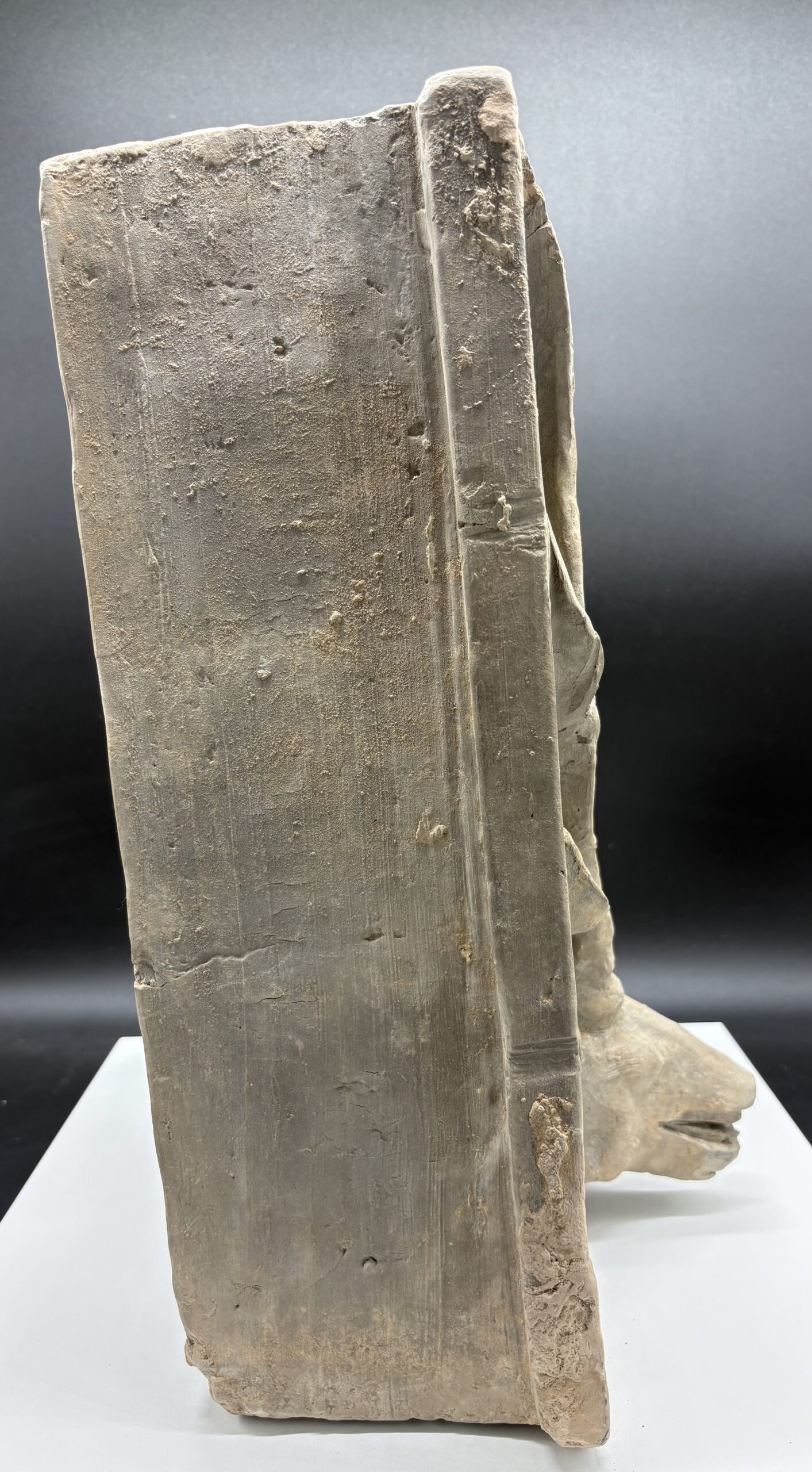 La terre cuite, à pâte dense et lourde, présente une patine minérale homogène, aux nuances de gris-beige, marquée par des concrétions, des érosions anciennes et de légères lacunes sur les arêtes, compatibles avec un enfouissement prolongé. L’ensemble dégage une forte présence archaïque, typique de la sculpture Han, où la puissance expressive prime sur le détail décoratif. L’état de conservation est remarquable pour un élément de cette nature et de cette époque. Malgré des usures superficielles, quelques éclats anciens et une érosion généralisée des reliefs, la sculpture demeure parfaitement lisible et structurellement intacte, sans restaurations visibles ni ajouts modernes.