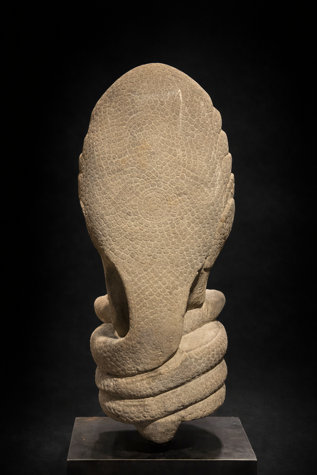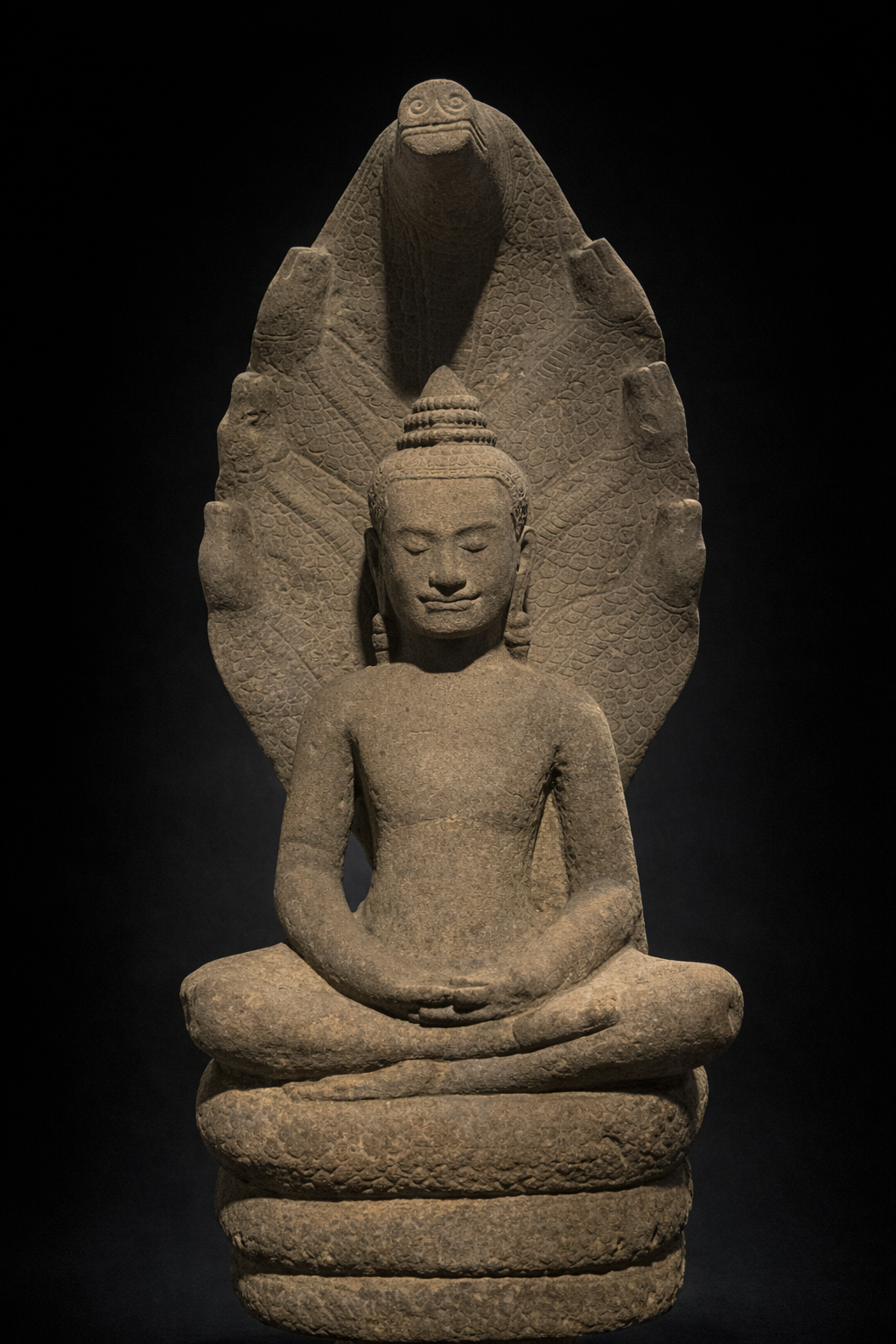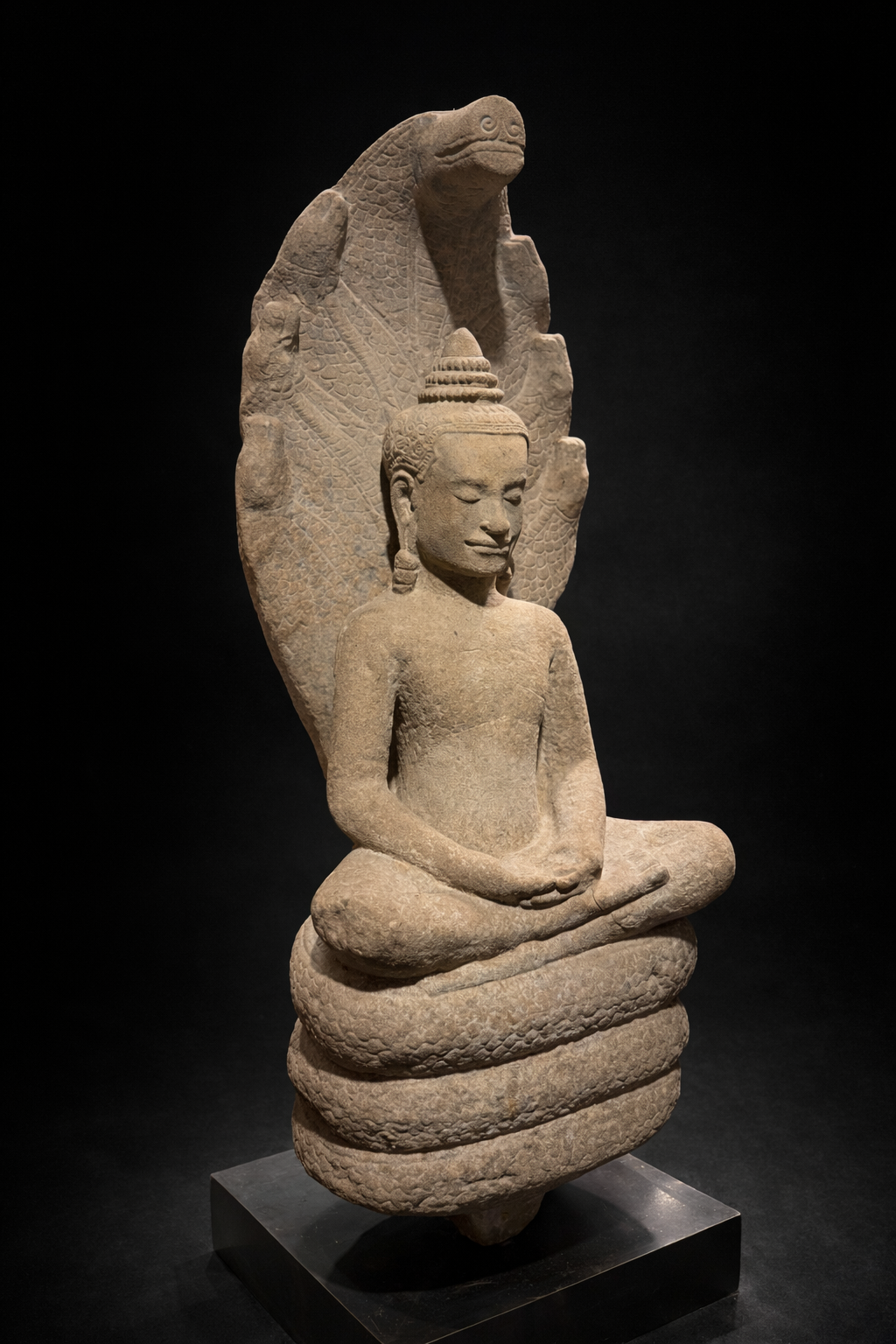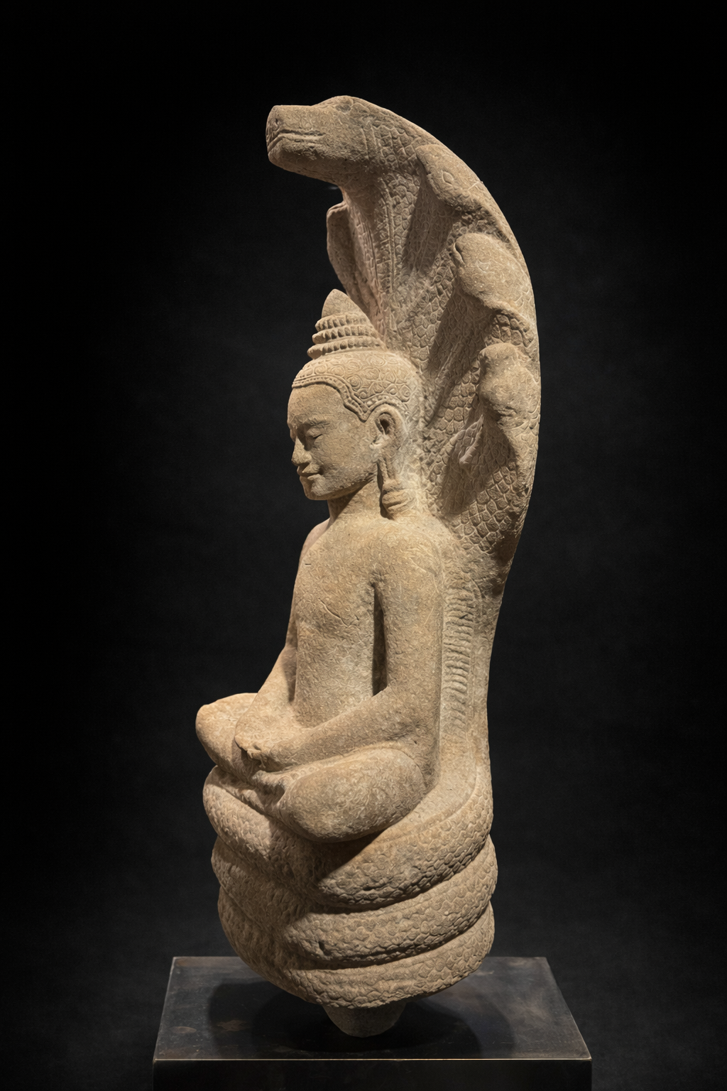 Le Bouddha est représenté assis en padmāsana, les mains réunies en dhyāna mudrā, attitude de méditation absolue. Le visage, d’une grande sérénité, se caractérise par des traits pleins et équilibrés, des paupières mi-closes, un arc sourcilier continu et un sourire à peine esquissé, traduisant une intériorité profonde. La chevelure stylisée est surmontée d’un ushnīsha conique à registres superposés, typique des productions khmères tardives. Le traitement du corps privilégie la frontalité et des volumes calmes, volontairement épurés, accentuant la dimension intemporelle et spirituelle de la figure. Le Nāga, sculpté en haut relief, déploie derrière le Bouddha un large capuchon aux écailles finement incisées, conçu comme une véritable aura protectrice. Son traitement graphique et répétitif, loin de toute recherche naturaliste, renforce la force symbolique de l’ensemble. Le socle intégré, orné de motifs évoquant les anneaux du serpent, participe à l’unité iconographique de la sculpture. La présence d’un tenon inférieur ancien, conservé, indique que la statue était à l’origine destinée à être fichée dans un socle ou un dispositif architectural, probablement au sein d’un sanctuaire ou d’un monastère.