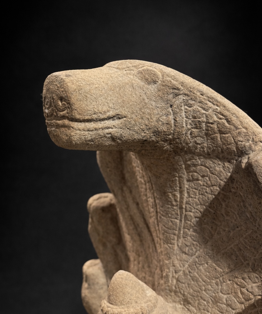 Grande sculpture en pierre représentant le Bouddha assis en profonde méditation, protégé par le roi des nāga, Mucilinda, dont le vaste capuchon se déploie derrière lui en une forme enveloppante et solennelle. L’épisode iconographique évoqué est l’un des plus anciens et des plus symboliques de la tradition bouddhique : après son Éveil, le Bouddha, surpris par une violente tempête, est protégé par le nāga qui enroule ses anneaux autour de lui et déploie son capuchon afin de le préserver des éléments. Cette scène incarne la protection cosmique accordée à l’Éveillé et la domination de la sagesse sur les forces primordiales.