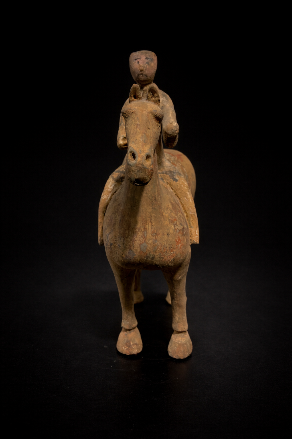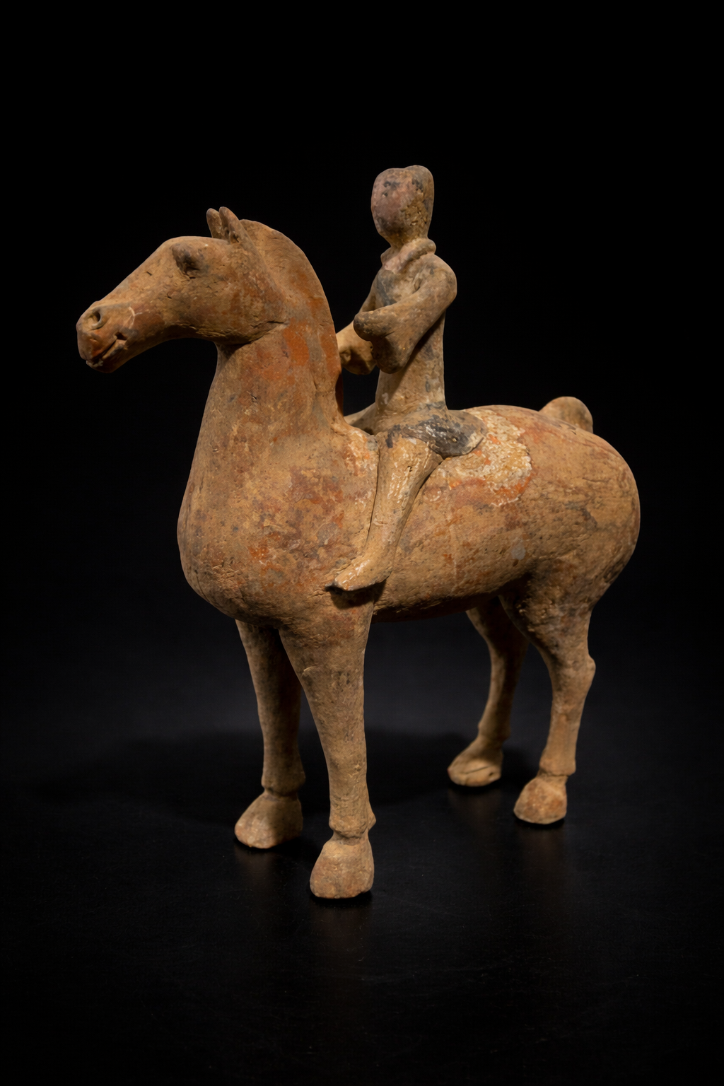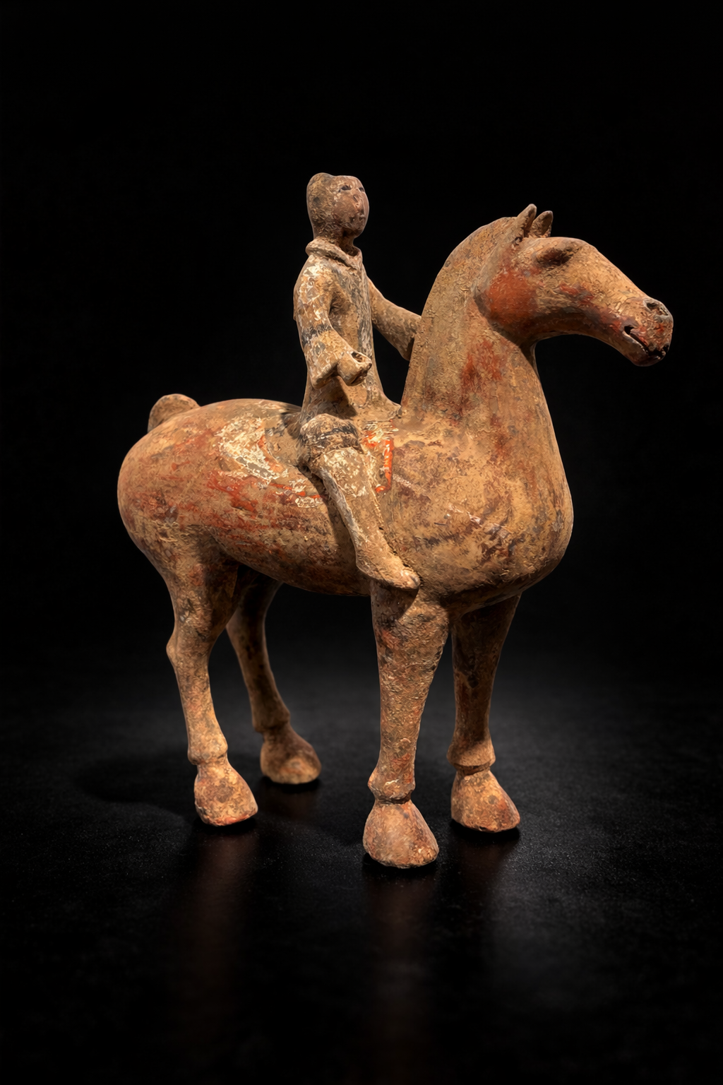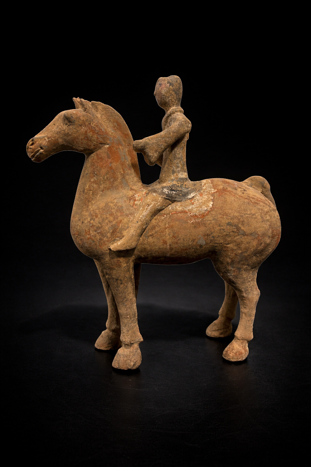 Cavalier archer monté sur son cheval, attribuable à la dynastie des Han. Le cheval, de proportions compactes et puissantes, repose sur quatre membres droits aux sabots stylisés. L’encolure est arquée, la tête tournée légèrement vers l’avant dans une attitude attentive. Les naseaux sont creusés, la bouche discrètement incisée, les oreilles dressées. La queue, courte et appliquée contre l’arrière-train, correspond au canon formel Han. Le cavalier adopte une posture hiératique. Il est représenté assis directement sur le dos du cheval, sans selle apparente ni harnachement développé, élément cohérent avec les représentations précoces de la période Han. Les bras sont ramenés vers l’avant, suggérant la tenue de rênes aujourd’hui disparues. Le visage est volontairement épuré, presque abstrait, selon l’esthétique funéraire de l’époque. Il porte sur son dos un carquois dans lequel étaient rangé les flèches à l’époque.