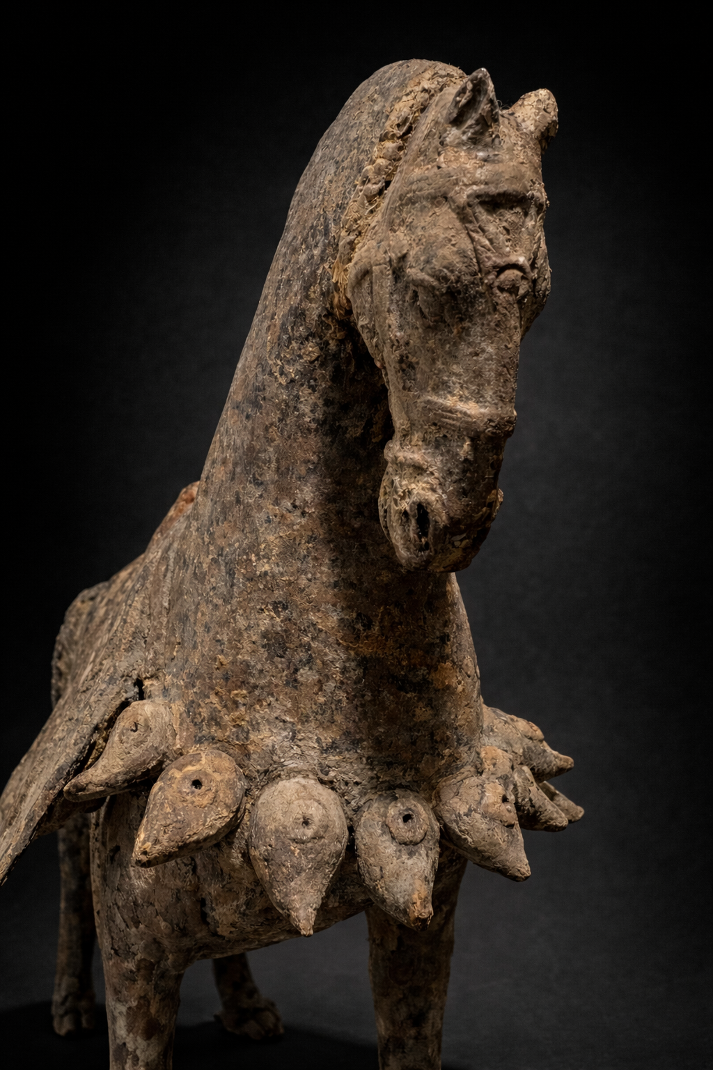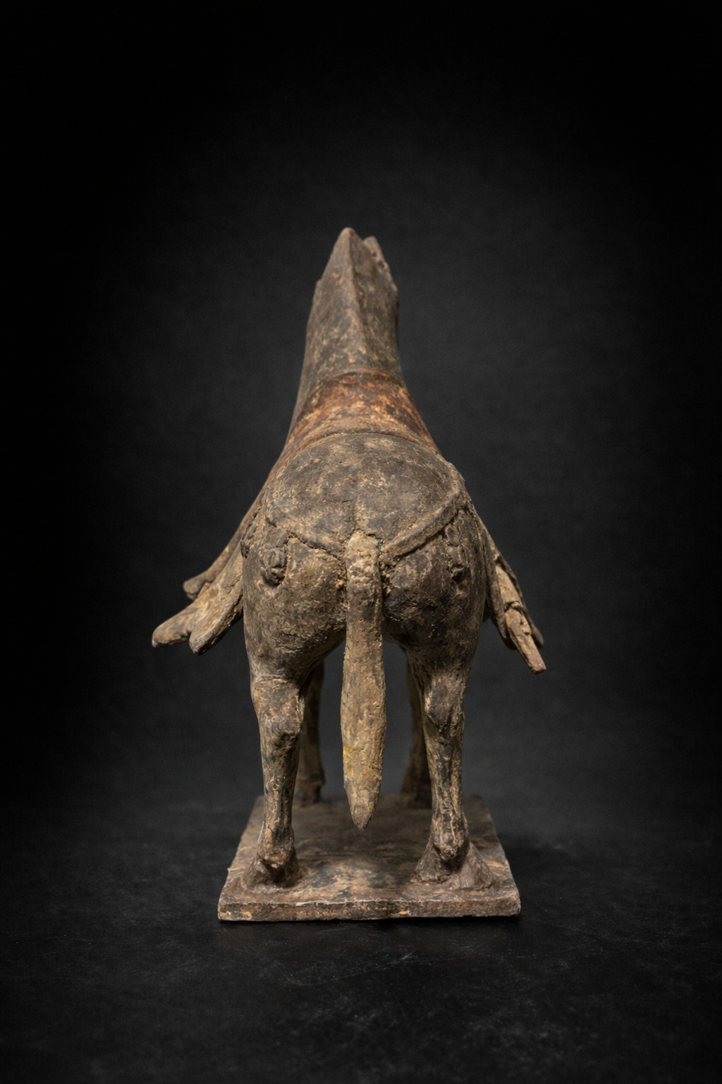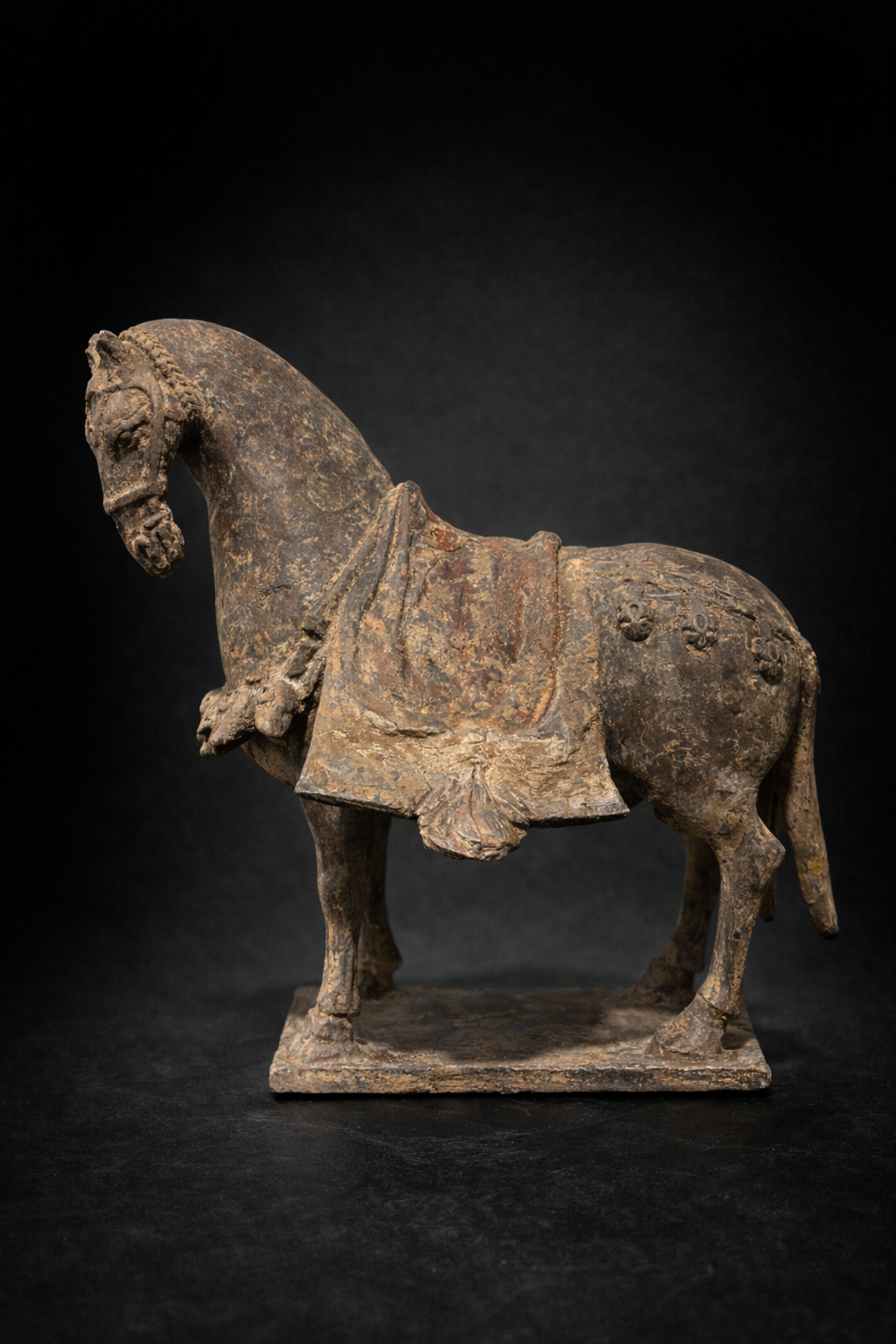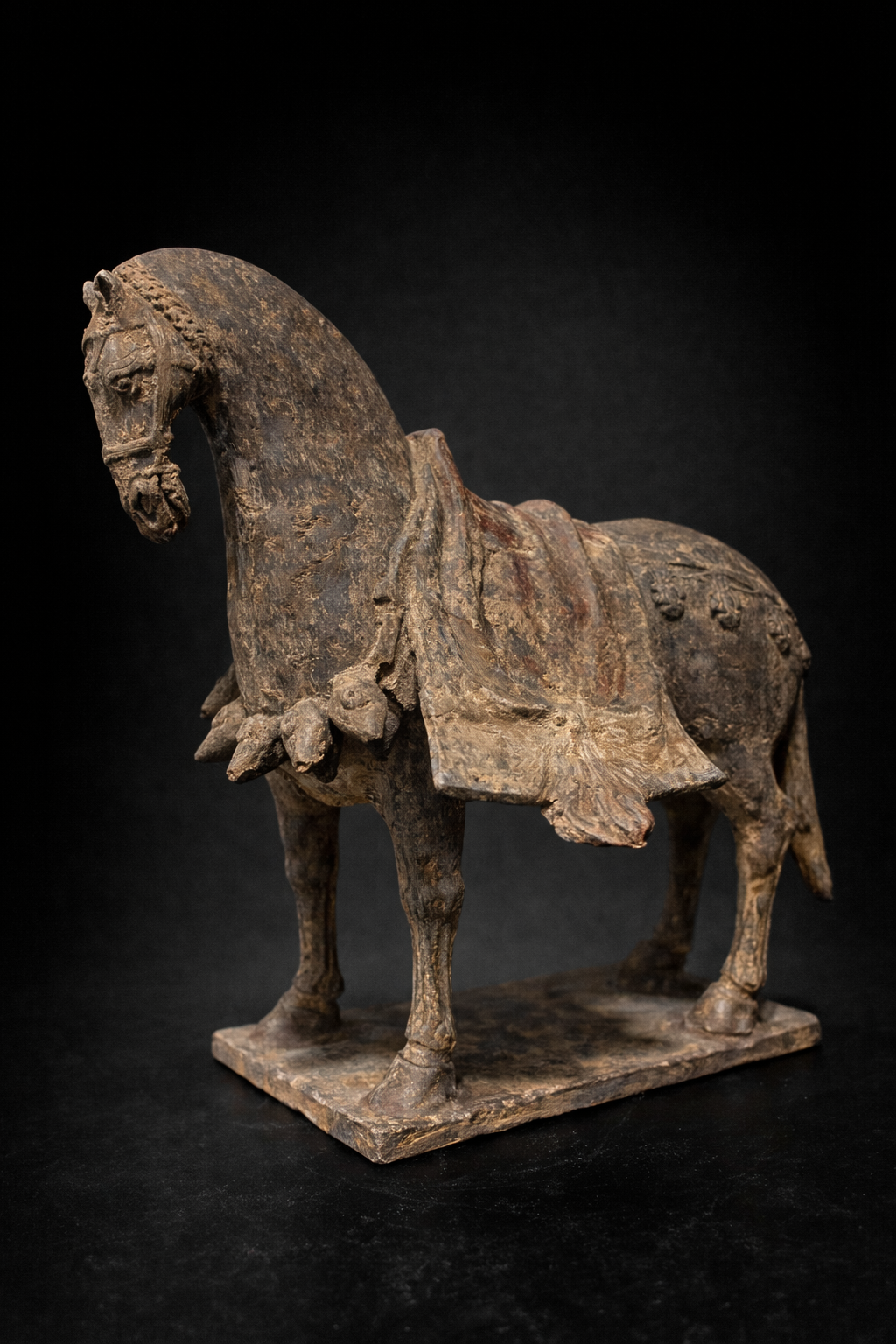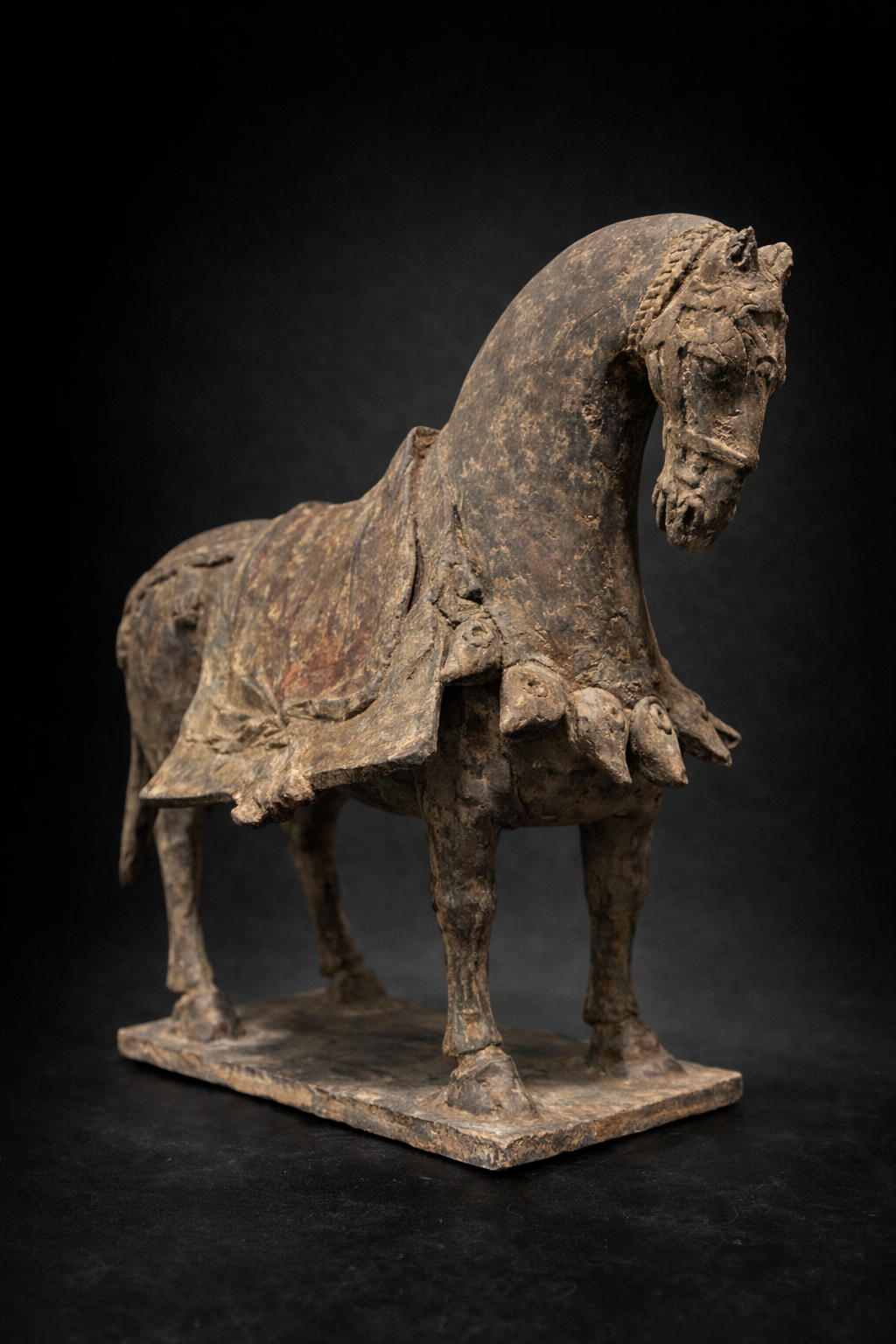 Sculpture représentant un cheval funéraire debout, modelé en terre cuite grise, reposant sur une base rectangulaire solidaire. L’animal adopte une posture calme et stable, les quatre membres solidement ancrés, traduisant une conception formelle encore rigoureuse, héritée des traditions anciennes, antérieure à l’exubérance des périodes ultérieures. La morphologie générale est caractéristique des productions Wei : le corps est compact, ramassé, avec une encolure longue et arquée, conduisant à une tête étroite au modelé sobre. La queue, longue et tombante, traitée en masse verticale, constitue un marqueur déterminant de datation, fréquemment observé sur les chevaux funéraires des Wei du Nord. L’animal est richement harnaché, avec un ensemble de brides, sangles et éléments décoratifs traités en relief. La couverture de selle à pans ouverts, retombant largement sur les flancs, est sculptée en larges plaques latérales, laissant apparaître les volumes du corps. Ce dispositif, clairement visible sur les vues latérales et arrière, correspond pleinement aux types Wei et se distingue nettement des caparaçons plus enveloppants et différemment structurés des chevaux Tang. Des traces de polychromie ancienne, notamment dans des tonalités rouges et brun-ocre, subsistent sous la patine grise dominante, attestant d’un décor originel aujourd’hui partiellement disparu mais typique des mingqi de cette période.