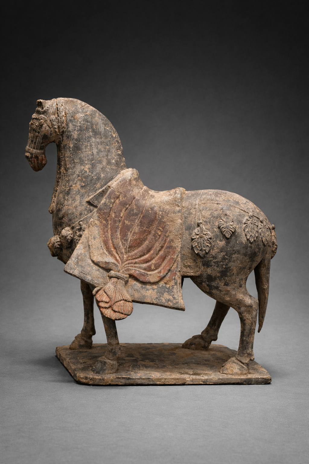 Sculpture en terre cuite représente un cheval de procession, figuré debout sur une base rectangulaire intégrée, dans une attitude calme et hiératique. L’animal est doté d’une encolure puissante et arquée, d’une tête allongée aux traits stylisés mais expressifs, et de membres fins se terminant par des sabots nettement individualisés. L’ensemble témoigne d’un souci d’équilibre et de monumentalité caractéristique de la statuaire funéraire chinoise du haut Moyen Âge. Le cheval est richement caparaçonné : une large housse de selle retombe de part et d’autre du corps, sculptée de plis profonds et encore partiellement rehaussée de pigments rouges et ocres. Sous l’encolure, un harnais ornemental est décoré de pendeloques zoomorphes et de grelots stylisés, symboles de prestige et de rang. Ces éléments rappellent l’équipement des chevaux de cour et de cavalerie lourde utilisés sous la dynastie Wei, période durant laquelle le cheval occupait une place centrale tant sur le plan militaire que symbolique. La surface présente une patine archéologique homogène, avec des traces d’engobe et de polychromie ancienne encore visibles, notamment sur la housse et les flancs. Les altérations, fissures et usures observées sont compatibles avec un enfouissement prolongé et renforcent l’authenticité de l’ensemble. Aucune restauration lourde ou repeint moderne n’est décelable à l’examen visuel. Sur le plan stylistique, ce cheval s’inscrit pleinement dans la tradition Wei : volumes pleins, modelé sobre mais puissant, traitement naturaliste tempéré par une stylisation élégante.