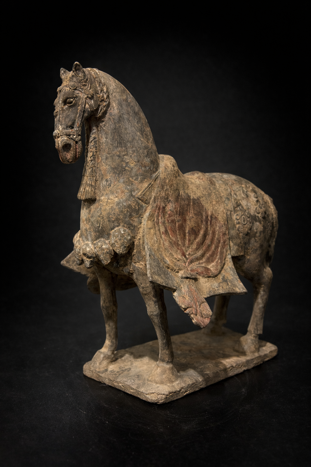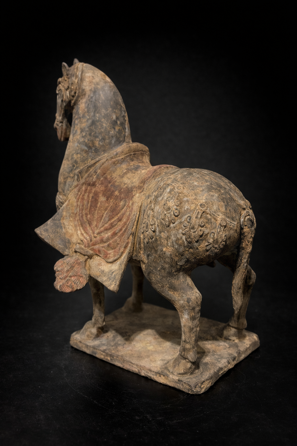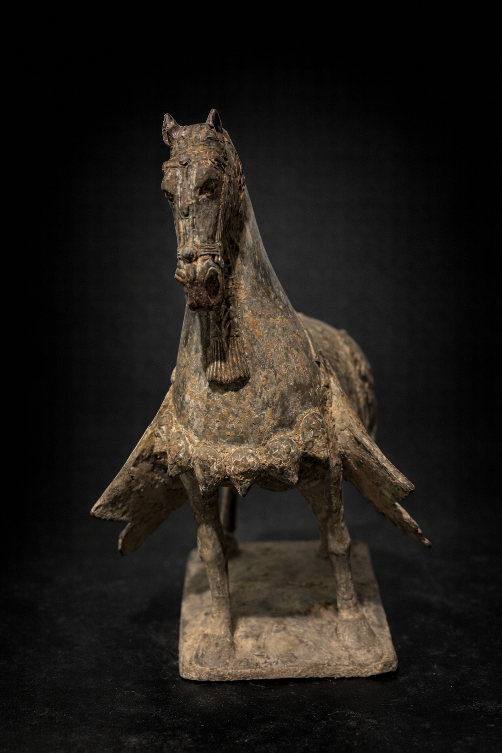 Sculpture représentant un cheval funéraire campé sur une base rectangulaire, réalisé en terre cuite grise, à la surface densément patinée par le temps. La silhouette se distingue par une construction plus verticale et nerveuse que les grands chevaux de parade de périodes postérieures : l’encolure, haute et arquée, porte une tête étroite au modelé ferme, tandis que le corps, ramassé et solide, repose sur quatre membres fins mais assurés. L’animal est harnaché à profusion : la bride et ses éléments sont marqués en relief, et l’ensemble du harnachement est rendu avec une insistance décorative typique de ces séries funéraires. La selle est recouverte d’une couverture à pans ouverts, retombant sur les flancs en deux larges panneaux latéraux. Ce détail, très parlant, distingue nettement ces modèles des chevaux Tang, dont les couvertures et caparaçons obéissent plus souvent à d’autres partis de draperies et à une monumentalité plus ample. Ici, les pans ouverts, comme découpés et suspendus, structurent visuellement la pièce et soulignent le caractère cérémoniel de l’équipement.