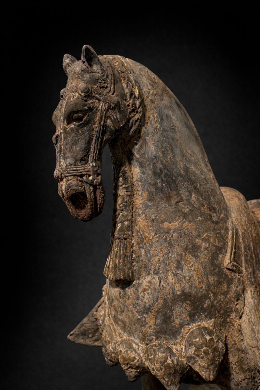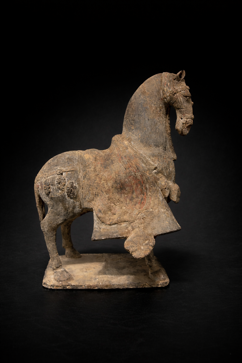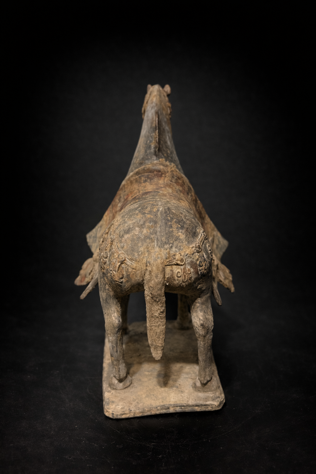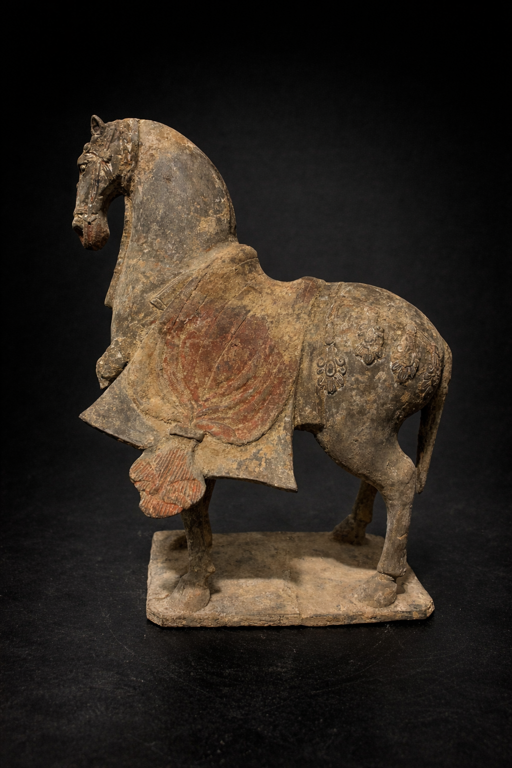 Sculpture représentant un cheval funéraire campé sur une base rectangulaire, réalisé en terre cuite grise, à la surface densément patinée par le temps. La silhouette se distingue par une construction plus verticale et nerveuse que les grands chevaux de parade de périodes postérieures : l’encolure, haute et arquée, porte une tête étroite au modelé ferme, tandis que le corps, ramassé et solide, repose sur quatre membres fins mais assurés. L’animal est harnaché à profusion : la bride et ses éléments sont marqués en relief, et l’ensemble du harnachement est rendu avec une insistance décorative typique de ces séries funéraires. La selle est recouverte d’une couverture à pans ouverts, retombant sur les flancs en deux larges panneaux latéraux. Ce détail, très parlant, distingue nettement ces modèles des chevaux Tang, dont les couvertures et caparaçons obéissent plus souvent à d’autres partis de draperies et à une monumentalité plus ample. Ici, les pans ouverts, comme découpés et suspendus, structurent visuellement la pièce et soulignent le caractère cérémoniel de l’équipement.
