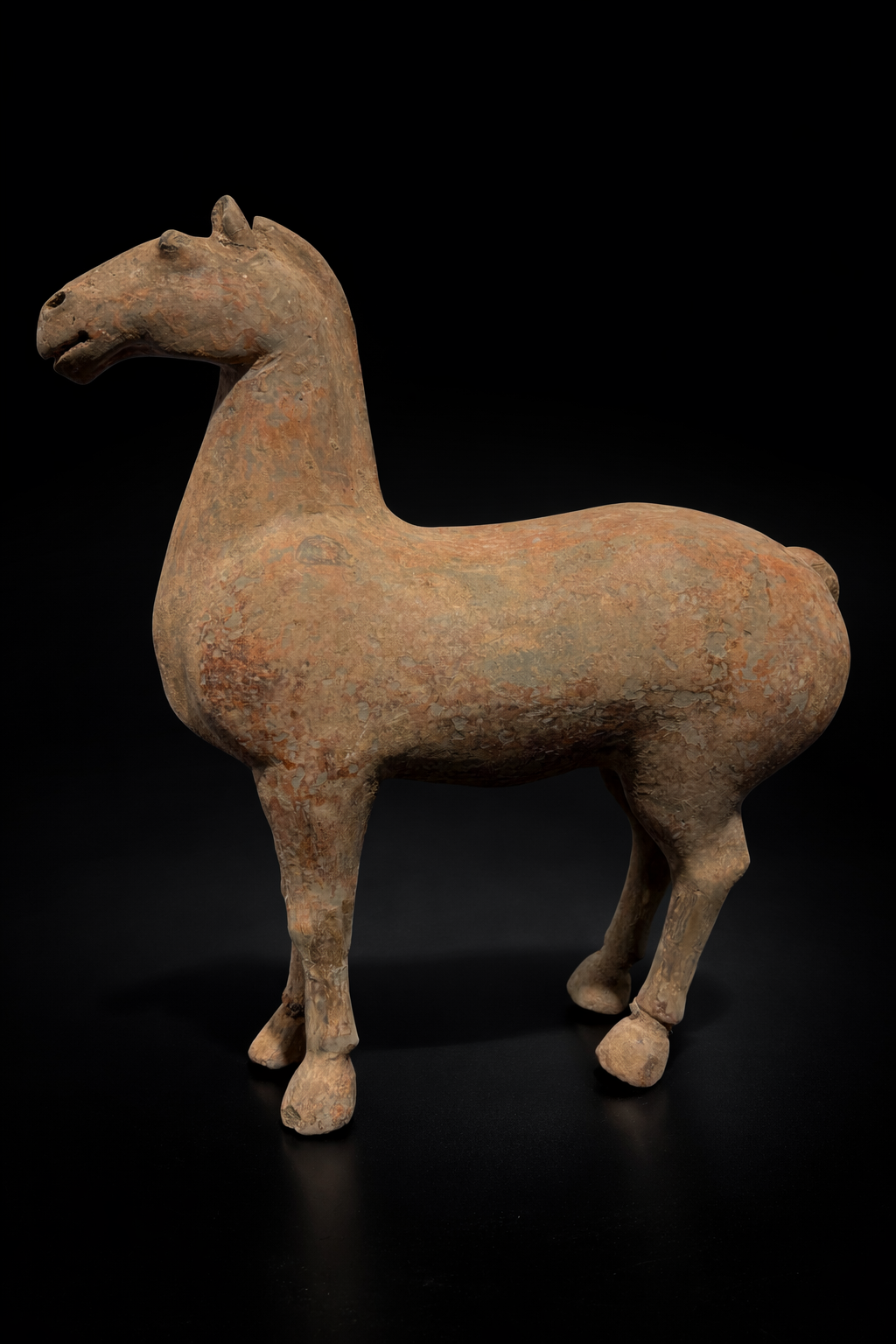 Cheval funéraire en terre cuite, datant de la dynastie des Han, représentant un équidé debout, à l’encolure dressée et à la tête légèrement avancée, dans une posture calme et stable. La silhouette est compacte et harmonieuse, le corps plein et légèrement cylindrique, les membres droits, terminés par des sabots stylisés reposant fermement sur un plan horizontal. La tête, au modelé sobre et expressif, présente des naseaux creusés, une bouche entrouverte et des oreilles dressées. L’encolure puissante s’inscrit dans une ligne continue jusqu’au garrot. La queue courte, détachée en léger relief à l’arrière-train, s’inscrit dans la tradition formelle Han. La terre cuite, à pâte ocre-gris, présente une surface richement texturée, avec de nombreuses traces d’engobe et de pigments résiduels brun-rouge et ocre, révélant un enfouissement ancien. Les variations chromatiques, les micro-écaillages naturels et les concrétions minérales superficielles témoignent d’une longue période de sépulture.