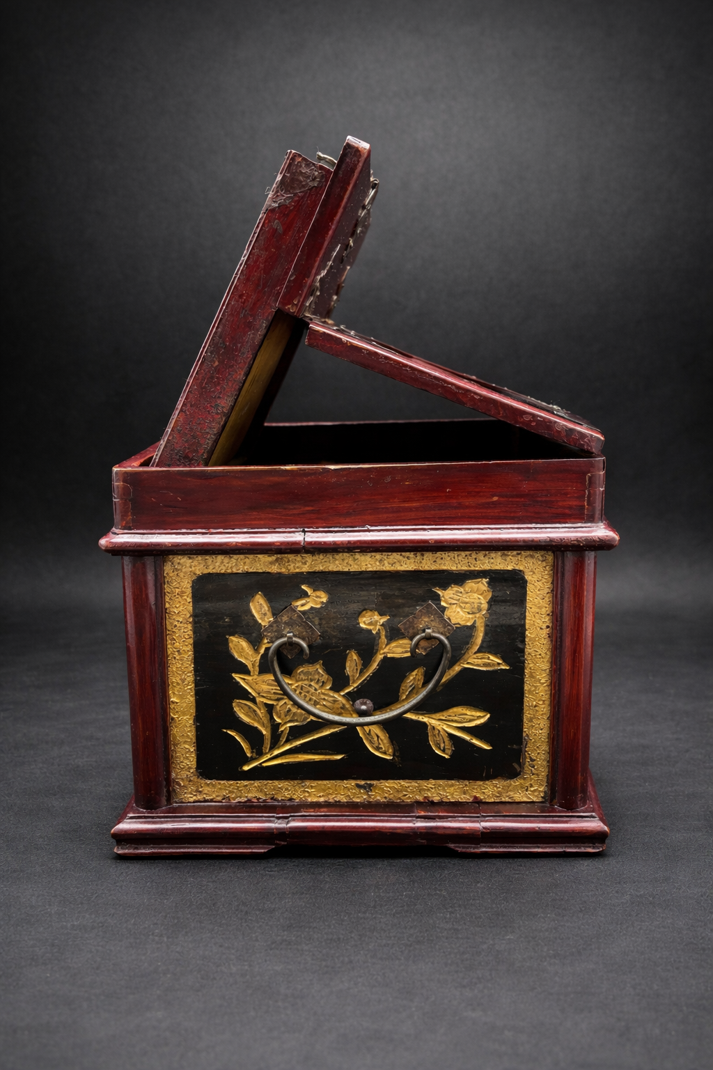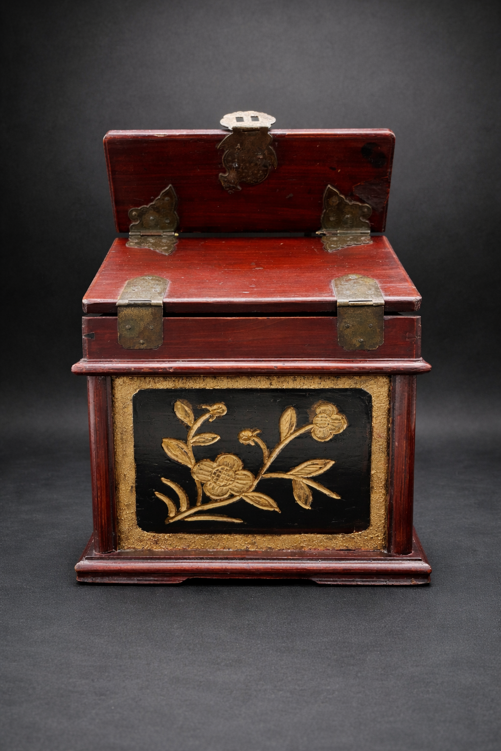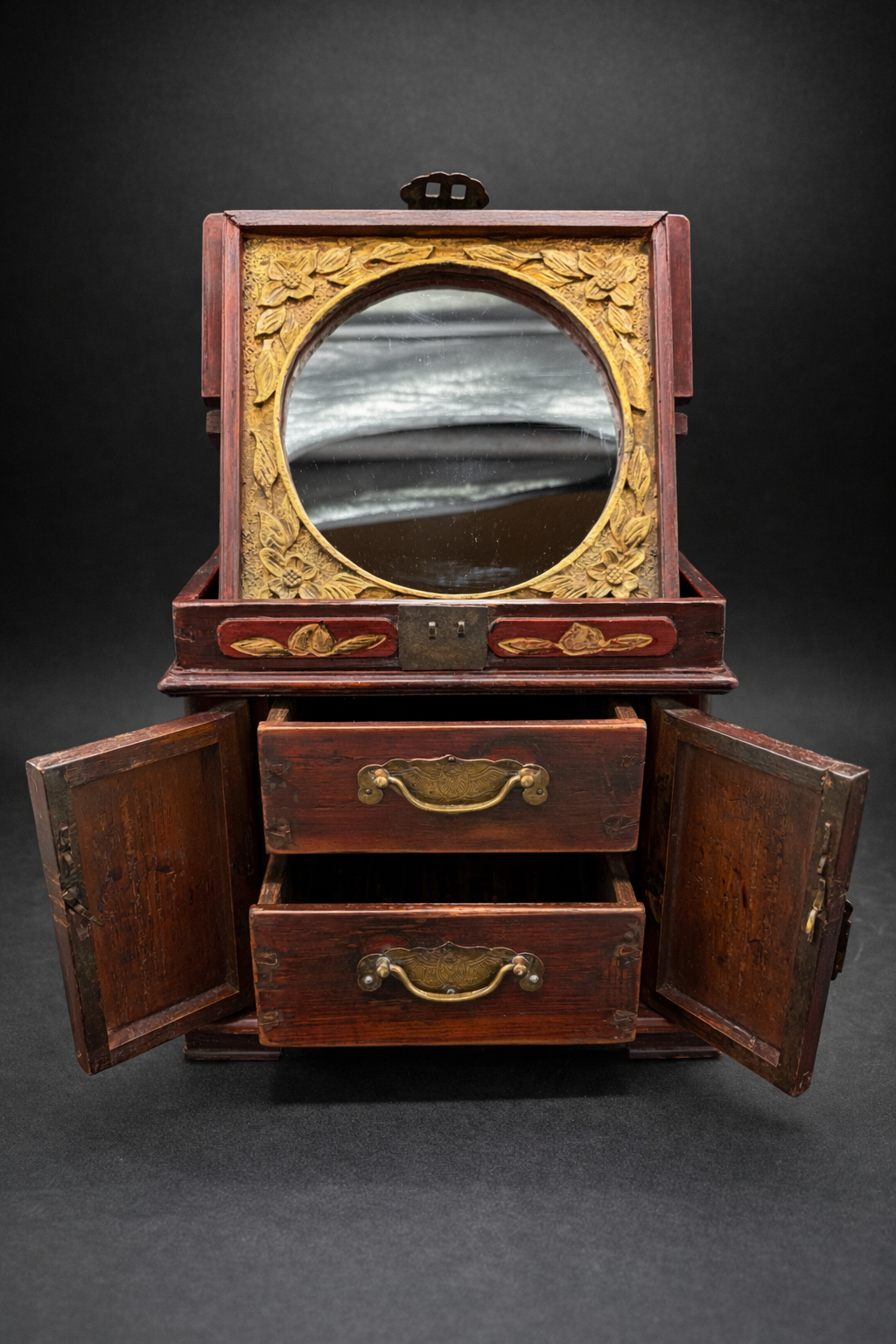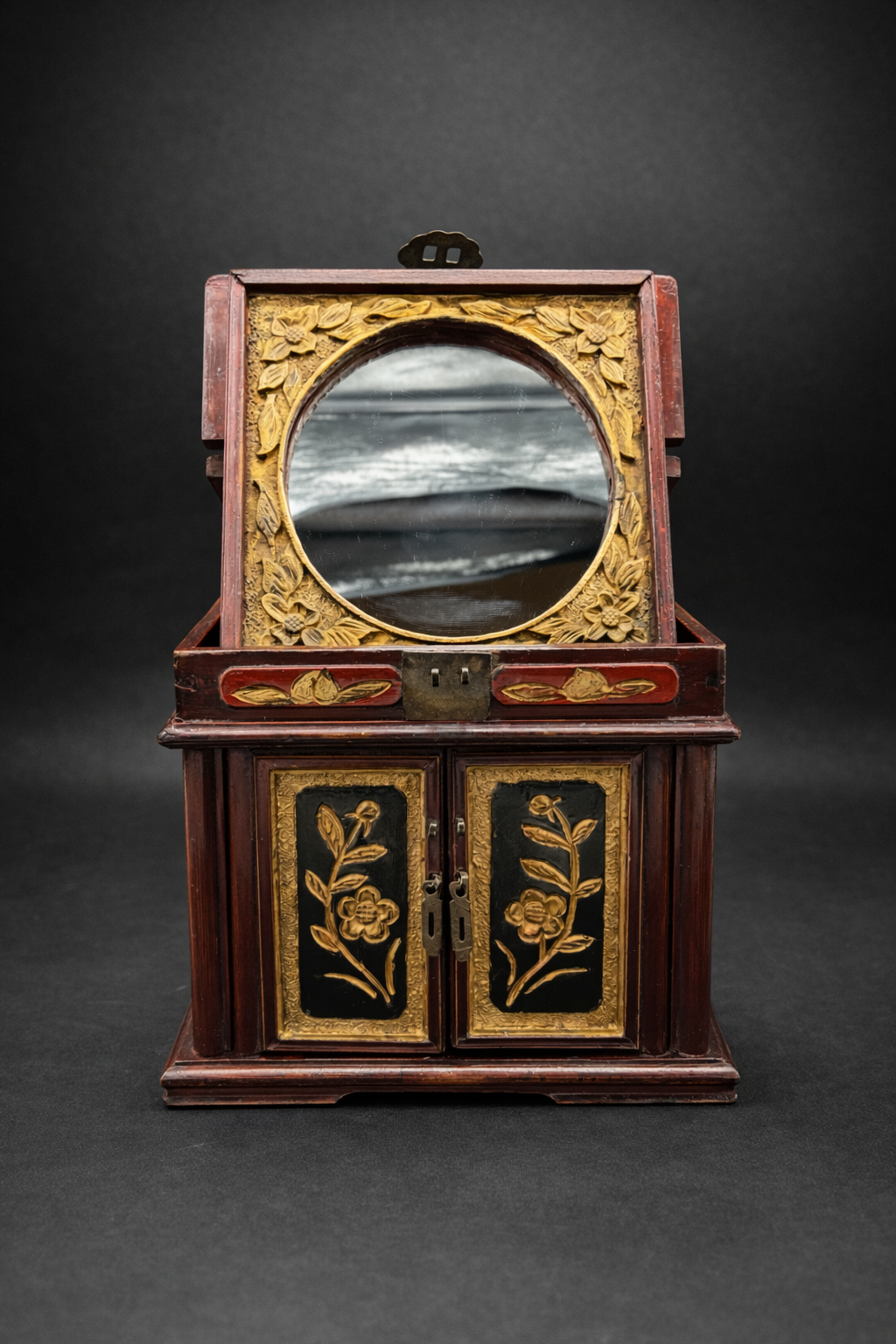 Ce coffret de toilette chinois en bois laqué appartient à la production domestique raffinée développée en Chine au tournant du 20ᵉ siècle, à une période marquée par l’évolution des usages et l’intégration progressive d’éléments de confort modernes. De forme carré, il se compose d’un corps principal ouvrant par deux portes battantes en façade, révélant un aménagement intérieur à deux tiroirs superposés, surmonté d’un compartiment supérieur à couvercle basculant intégrant un miroir circulaire. Le bois est recouvert d’une laque brun rouge profond, aujourd’hui patinée par le temps, laissant apparaître des usures naturelles aux arêtes et zones de manipulation. Les panneaux des portes, ainsi que certaines faces latérales, sont ornés de décors floraux en relief rehaussés de dorure, se détachant sur un fond sombre. Ces motifs végétaux, traités de manière décorative plutôt que symbolique, relèvent d’un vocabulaire ornemental courant dans les productions chinoises tardives destinées à un usage bourgeois ou semi-urbain. Le miroir circulaire, enchâssé dans le couvercle supérieur, est un miroir ancien en verre, présentant des altérations de surface et piqûres compatibles avec une fabrication du début du 20ᵉ siècle. Son intégration au meuble témoigne de l’adaptation de formes traditionnelles chinoises à des usages modernes, sous influence occidentale. Les ferrures en alliage cuivreux, épaisses et solidement découpées, comprennent charnières apparentes, entrées de serrure et poignées de tirage. Leur morphologie, volontairement robuste, ainsi que les assemblages à queues d’aronde visibles, confirment une fabrication chinoise, privilégiant la solidité structurelle et la lisibilité constructive.
