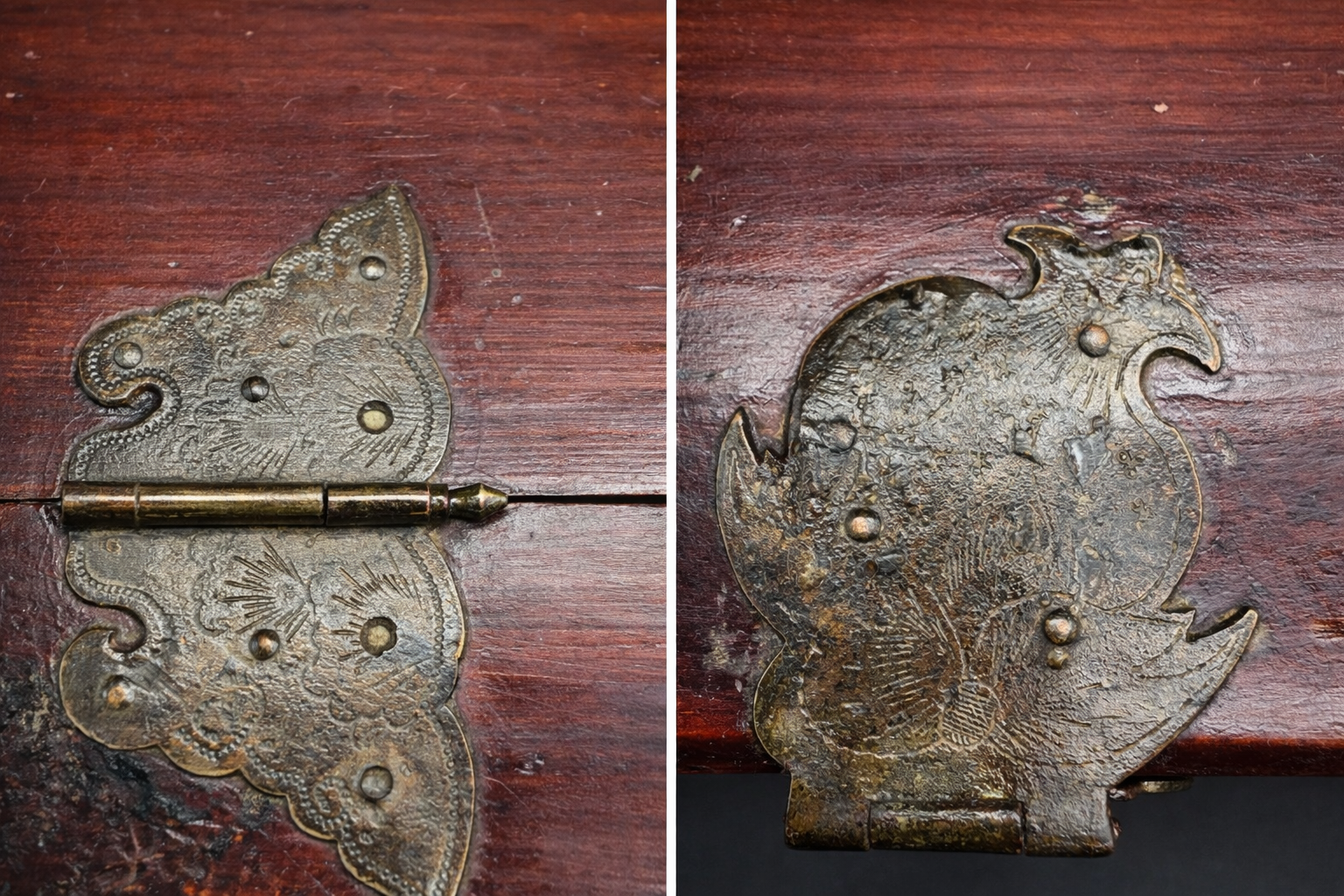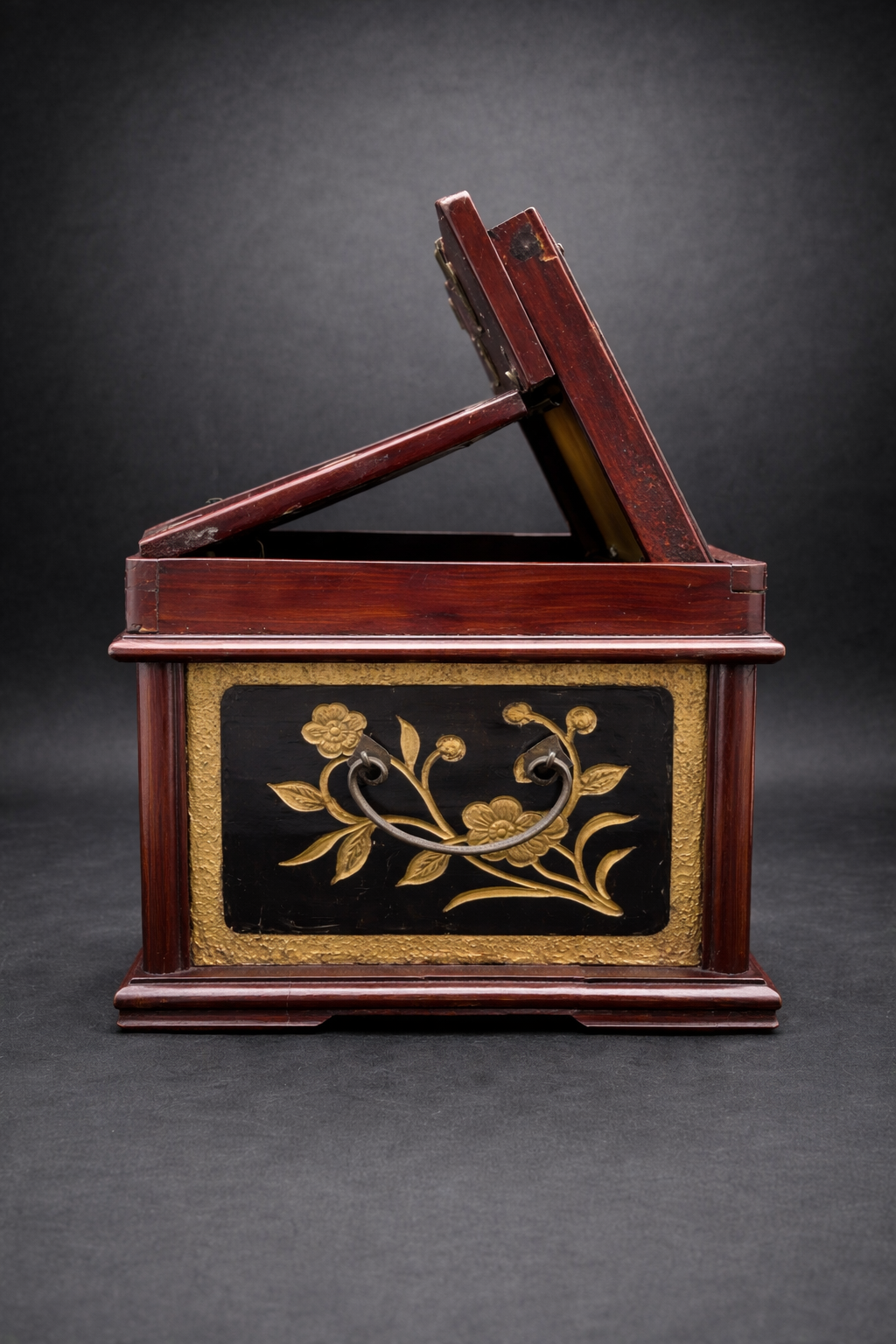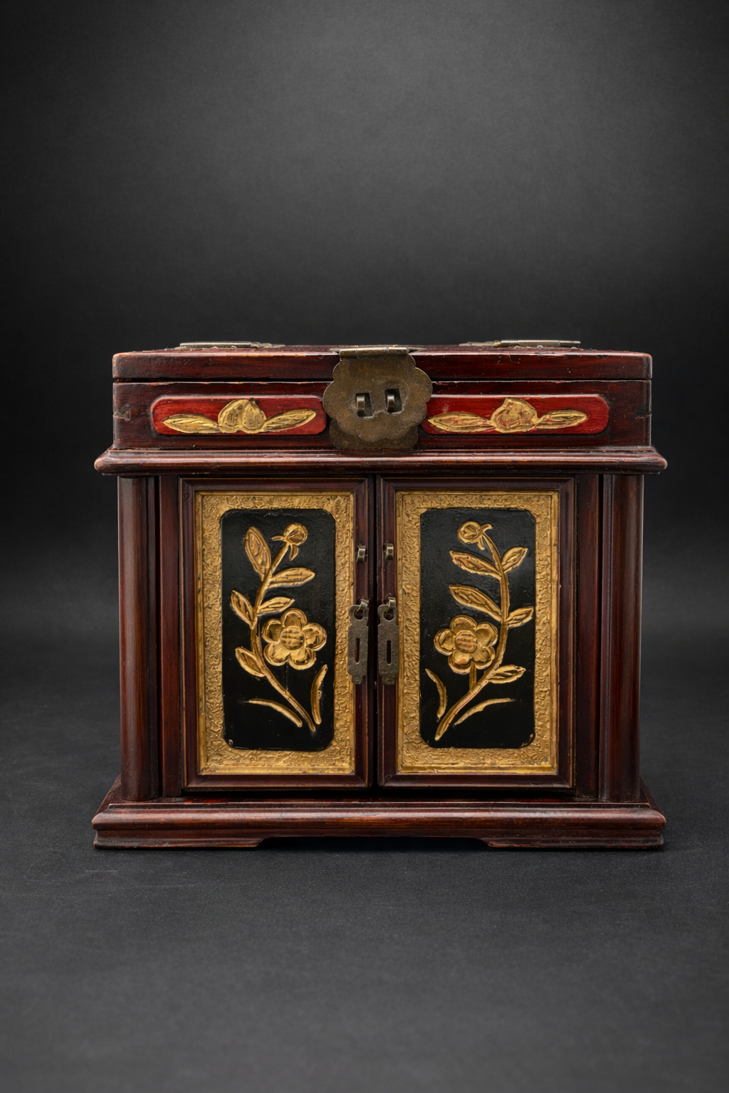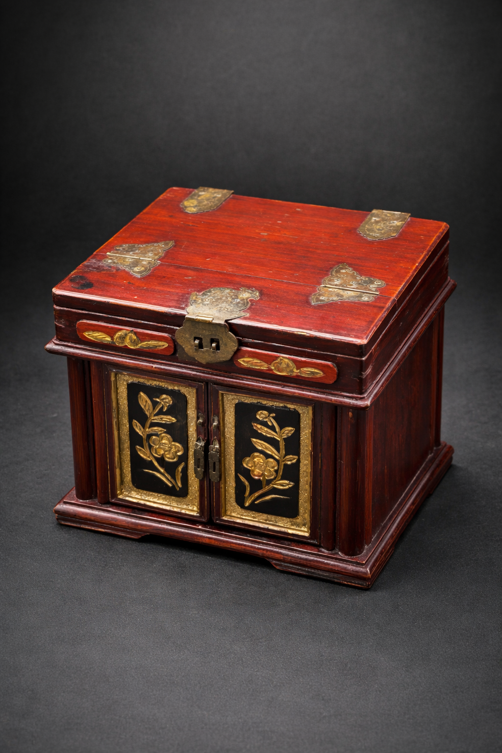 Ce coffret de toilette chinois en bois laqué appartient à la production domestique raffinée développée en Chine au tournant du 20ᵉ siècle, à une période marquée par l’évolution des usages et l’intégration progressive d’éléments de confort modernes. De forme carré, il se compose d’un corps principal ouvrant par deux portes battantes en façade, révélant un aménagement intérieur à deux tiroirs superposés, surmonté d’un compartiment supérieur à couvercle basculant intégrant un miroir circulaire. Le bois est recouvert d’une laque brun rouge profond, aujourd’hui patinée par le temps, laissant apparaître des usures naturelles aux arêtes et zones de manipulation. Les panneaux des portes, ainsi que certaines faces latérales, sont ornés de décors floraux en relief rehaussés de dorure, se détachant sur un fond sombre. Ces motifs végétaux, traités de manière décorative plutôt que symbolique, relèvent d’un vocabulaire ornemental courant dans les productions chinoises tardives destinées à un usage bourgeois ou semi-urbain. Le miroir circulaire, enchâssé dans le couvercle supérieur, est un miroir ancien en verre, présentant des altérations de surface et piqûres compatibles avec une fabrication du début du 20ᵉ siècle. Son intégration au meuble témoigne de l’adaptation de formes traditionnelles chinoises à des usages modernes, sous influence occidentale. Les ferrures en alliage cuivreux, épaisses et solidement découpées, comprennent charnières apparentes, entrées de serrure et poignées de tirage. Leur morphologie, volontairement robuste, ainsi que les assemblages à queues d’aronde visibles, confirment une fabrication chinoise, privilégiant la solidité structurelle et la lisibilité constructive.