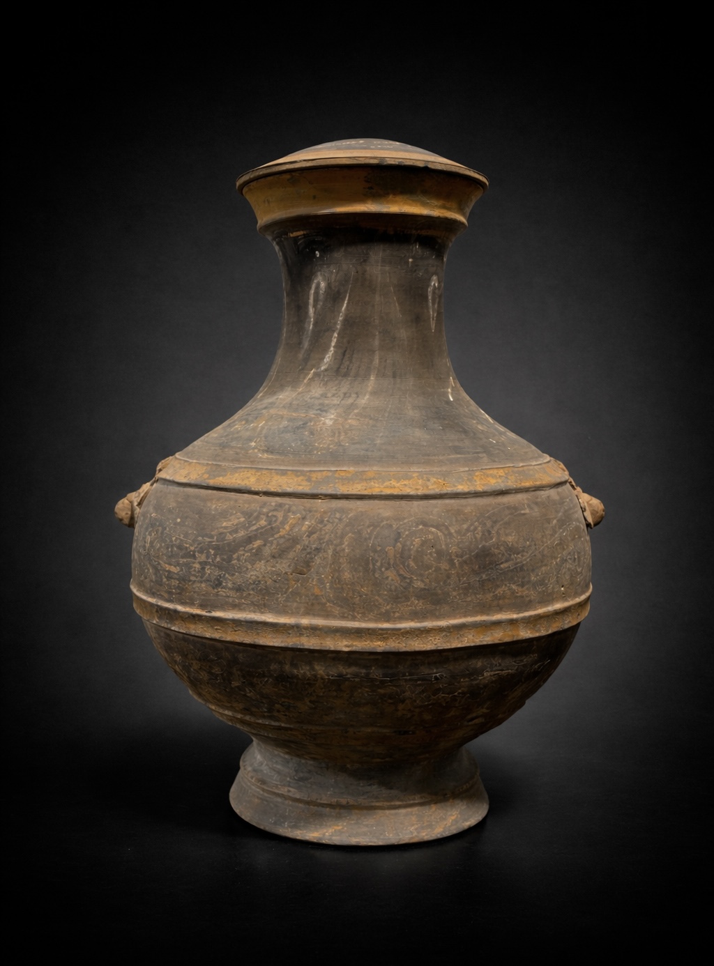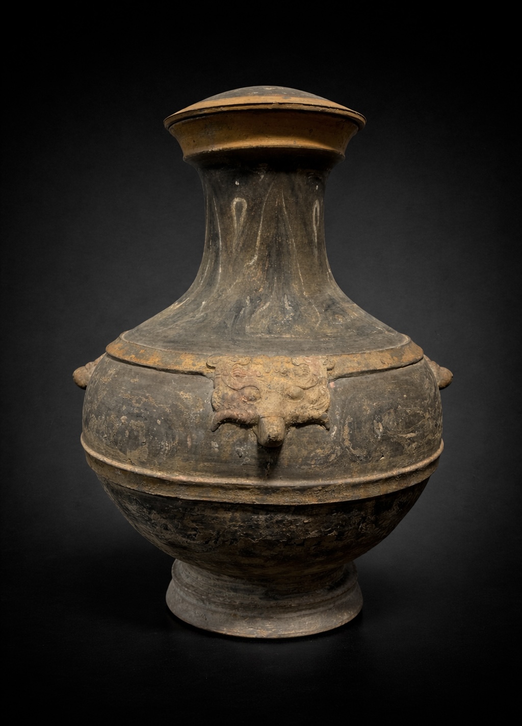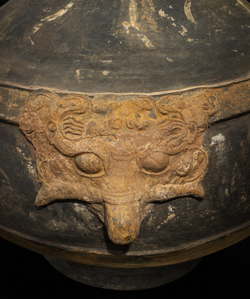 Vase monumental de 53 centimètres ne se contentant pas d’occuper l’espace ; il impose la stature d’une aristocratie Han parvenue au faîte de sa puissance. Forme iconique de la Chine antique, ce Hu couvert est une métamorphose : il transpose dans l’argile grise le luxe des bronzes rituels réservés aux banquets de l’élite. Sa silhouette globulaire, d’une stabilité souveraine, s’élève sur un piédouche robuste pour s’épanouir en un col évasé que vient clore son couvercle d’origine. Sur les épaules du vase, deux masques de Taotie émergent de la matière avec une force archaïque. Ces créatures mythiques, aux traits sculptés en relief vigoureux, fixent l’invisible pour protéger le contenu sacré du récipient. Entre ces figures tutélaires, le peintre a laissé courir des volutes d’ocre et d’orange, nuées stylisées de Yunwen qui semblent encore vibrer du Qi, ce souffle de vie que le défunt emporte avec lui. La persistance de ces pigments, deux millénaires après leur application, offre un témoignage rare de la polychromie qui colorait autrefois le silence des tombes princières.
