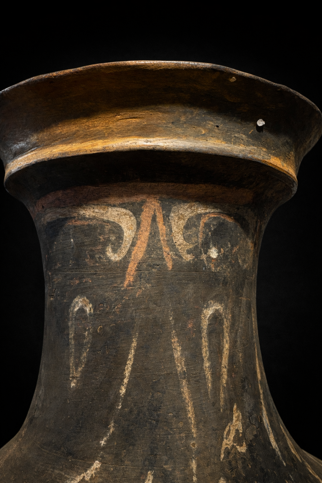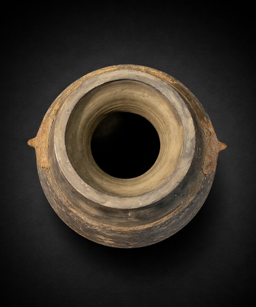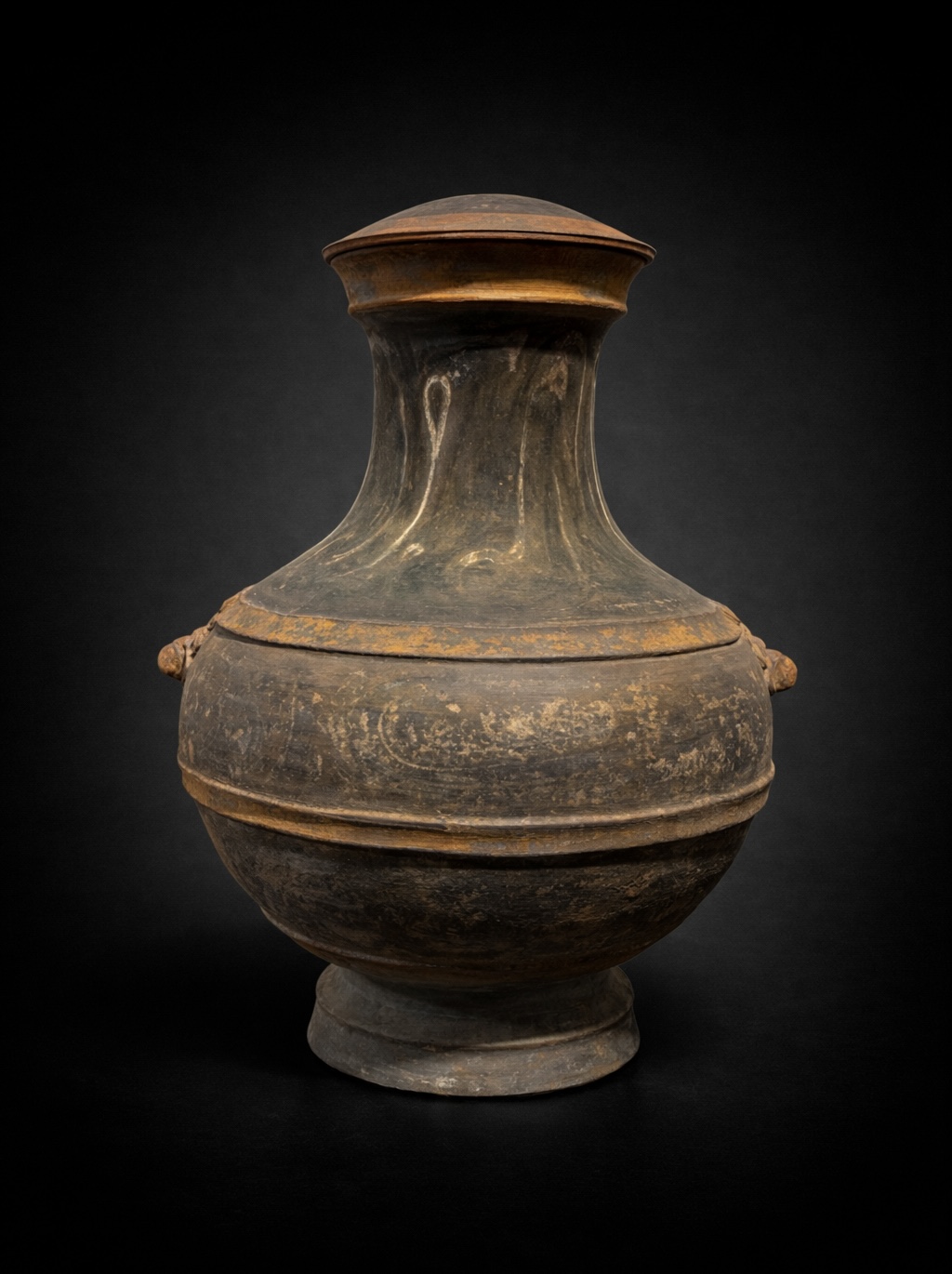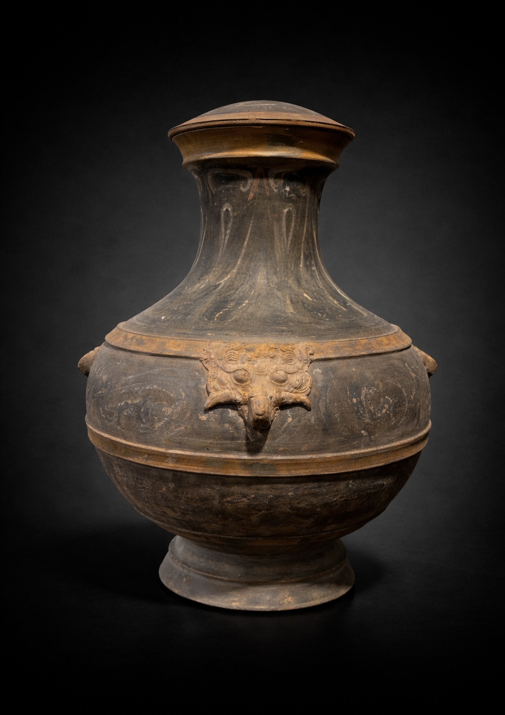 Vase monumental de 53 centimètres ne se contentant pas d’occuper l’espace ; il impose la stature d’une aristocratie Han parvenue au faîte de sa puissance. Forme iconique de la Chine antique, ce Hu couvert est une métamorphose : il transpose dans l’argile grise le luxe des bronzes rituels réservés aux banquets de l’élite. Sa silhouette globulaire, d’une stabilité souveraine, s’élève sur un piédouche robuste pour s’épanouir en un col évasé que vient clore son couvercle d’origine. Sur les épaules du vase, deux masques de Taotie émergent de la matière avec une force archaïque. Ces créatures mythiques, aux traits sculptés en relief vigoureux, fixent l’invisible pour protéger le contenu sacré du récipient. Entre ces figures tutélaires, le peintre a laissé courir des volutes d’ocre et d’orange, nuées stylisées de Yunwen qui semblent encore vibrer du Qi, ce souffle de vie que le défunt emporte avec lui. La persistance de ces pigments, deux millénaires après leur application, offre un témoignage rare de la polychromie qui colorait autrefois le silence des tombes princières.