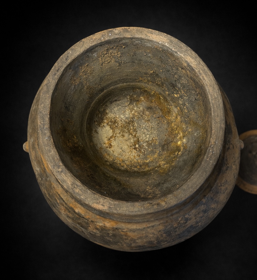 L’objet porte en lui les stigmates nobles de son histoire souterraine. Sa surface est un paysage où le gris de la terre cuite dialogue avec des concrétions calcaires blanchâtres et des sédiments ocre, véritables sceaux du temps apposés par les siècles. La conservation exceptionnelle du couvercle, pièce souvent sacrifiée par les âges, achève de faire de ce vase un témoin d’exception.