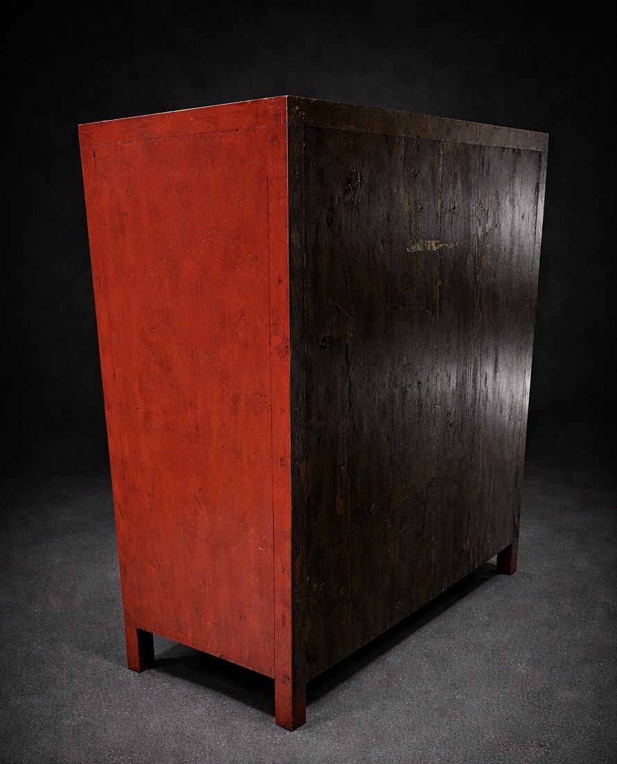 Ce meuble se présente comme un important meuble d’apothicaire à structure rectangulaire, reposant sur quatre montants droits et intégralement composé de quarante-cinq tiroirs de petit format disposés en façade selon une trame strictement orthogonale. L’ensemble forme un volume monumental, à la fois fonctionnel et architecturé, caractéristique du mobilier professionnel chinois destiné aux usages médicaux traditionnels. La structure est réalisée en bois massif, entièrement recouverte d’une laque rouge profonde appliquée en couches successives. Cette couleur, emblématique du mobilier chinois, est traditionnellement associée à la protection, à la prospérité et à la pérennité. Elle confère au meuble une forte présence visuelle tout en assurant une protection durable du support ligneux. Chaque tiroir est pourvu d’une garniture métallique en alliage cuivreux comprenant une plaque décorative ajourée et un anneau de tirage mobile. Ces éléments, aujourd’hui patinés, présentent un décor stylisé conforme au vocabulaire ornemental des meubles d’apothicairerie chinois, où la répétition des motifs accompagne une organisation rationnelle et méthodique. Cachet en cire à l’arrière de la douane chinoise.