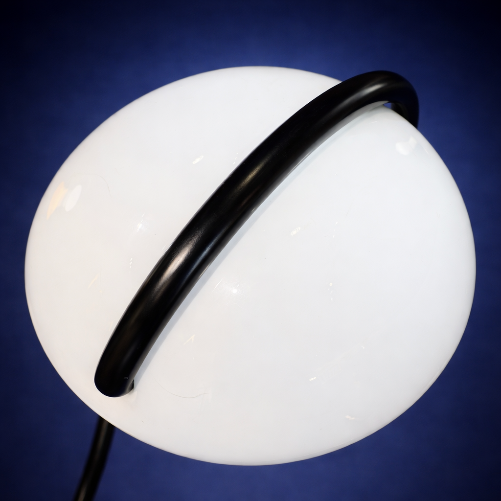 La stature de ce lampadaire impose le respect. Le contraste entre le fût élancé en métal laqué noir et le large dôme en méthacrylate blanc crée une dynamique visuelle unique. Son état de conservation, avec ses marquages d’origine, en fait une pièce de collection de premier plan. Née de l’audace du design italien des « années lumière », la lampe Serpente est bien plus qu’un luminaire : c’est une sculpture cinétique. Conçue par Elio Martinelli en 1965, elle incarne l’optimisme technologique et l’élégance minimaliste de l’époque. Sa silhouette, qui semble défier la gravité, a marqué l’histoire du design industriel en introduisant de nouveaux matériaux et un mouvement rotatif inédit, lui valant une place dans les collections permanentes du MoMA à New York.