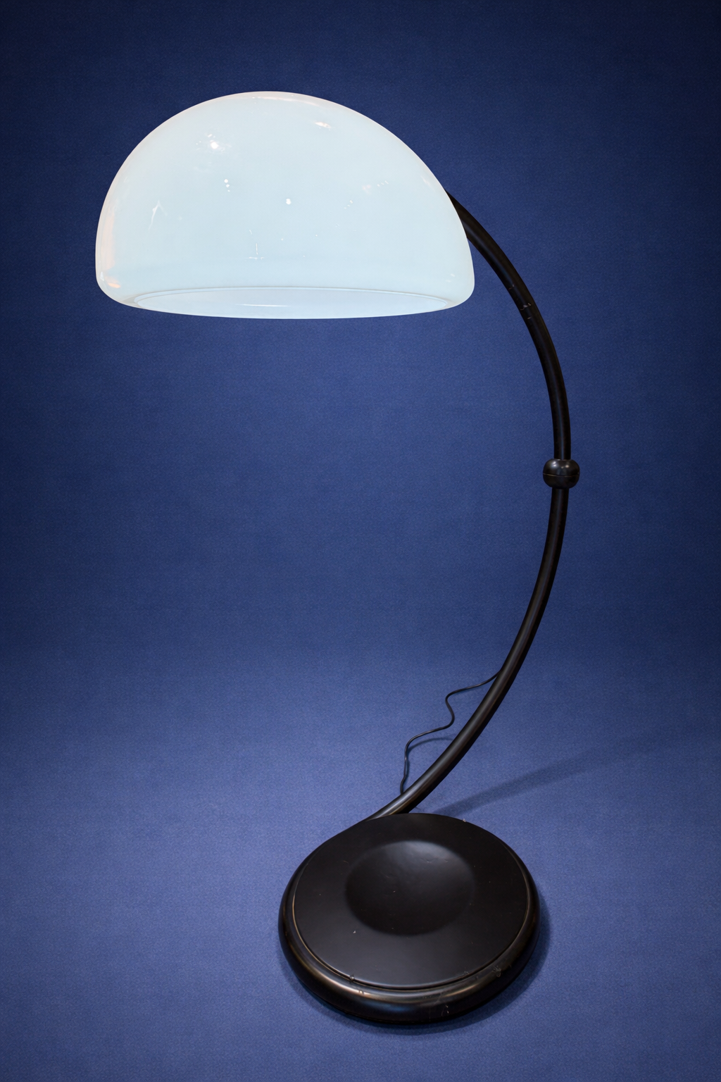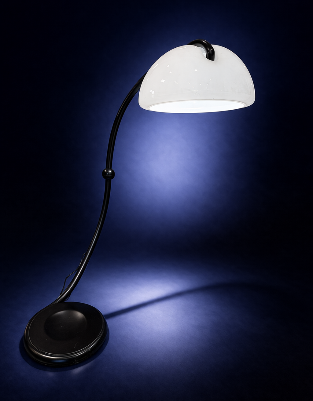 La magie de cette lampe réside dans son articulation cachée. Le joint tournant entre la base et le bras est une prouesse de discrétion, permettant au luminaire de se métamorphoser selon l’angle choisi. Ce jeu entre le plein du diffuseur et le vide créé par la courbe du bras structure l’espace de manière dynamique. Elle n’impose pas sa présence, elle s’adapte à l’architecture de la pièce.