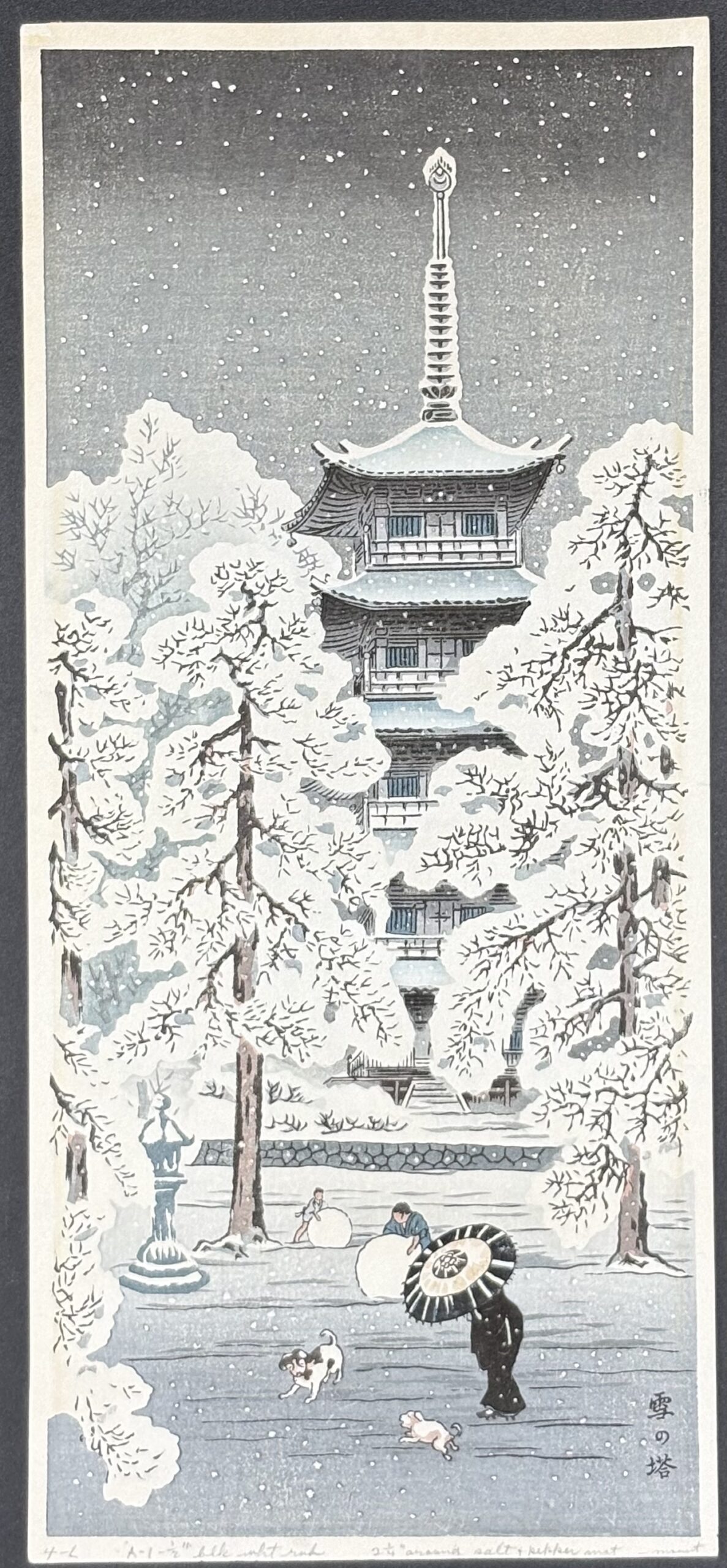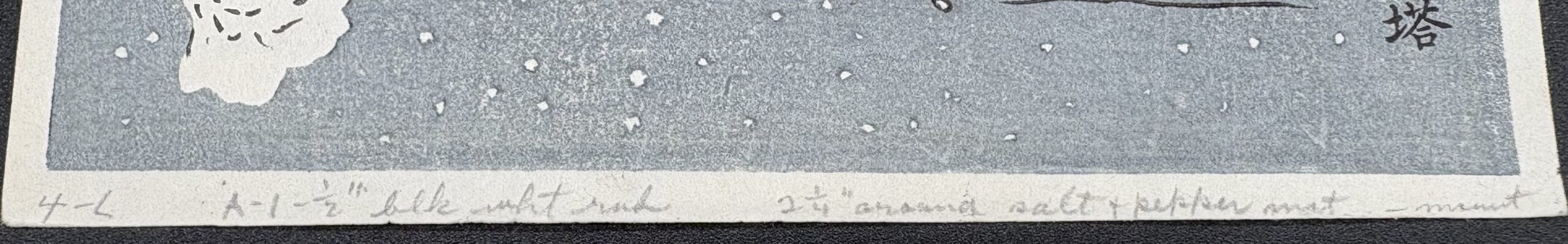 Estampe shin-hanga, de Hiroaki Takahashi (Shotei). Titre:“Snow at Asakusa« . Variante rare / 2e état de l’impression. Shotei a créé près de 500 œuvres, lorsque le tremblement de terre de Kanto a frappé et a détruit tous les blocs et l’inventaire. 1923 a été une année difficile pour Wanatabe Shozaburo. Le tremblement de terre de Kanto a détruit son bâtiment et tout son inventaire / blocs dans l’incendie. Bien qu’en 1924, son équipe d’artistes ait montré un certain soutien, en 1925, tous ses artistes exclusifs ont dû rompre leur contrat avec Wanatabe pour des raisons financières. Kawase Hasui a commencé à travailler pour la première fois avec un autre éditeur (Isetatsu), Hiroshi Yoshida a décidé d’auto-publier, Shiro Kasamatsu a cessé d’imprimer jusqu’en 1930, et son ami de longue date Shotei aussi, a dû utiliser d’autres éditeurs pour payer ses factures. Ce n’est qu’en 1930 que beaucoup de ces artistes, dont Shotei, ont recommencé à faire beaucoup d’affaires avec Wanatabe. À partir de 1925, Shotei a utilisé d’autres éditeurs et a imprimé / réimprimé des dessins similaires d’avant le tremblement de terre, parfois étiquetés à tort comme faux ou plagiat ; bien qu’il s’agisse simplement d’originaux ou de variantes fabriqués par Shotei, et non publiés par Wanatabe Shozaburo, car celui-ci construisait son entreprise.