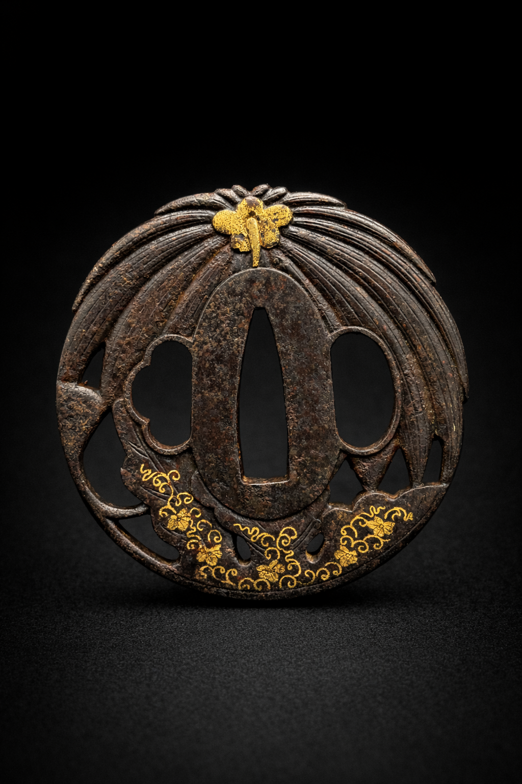 Tsuba japonaise en fer de forme circulaire, finement ajourée et sculptée. Le décor est en forme de chrysanthèmes, le feuillage et pistils incrusté de cuivre doré (nunome-zōgan). La composition est dominée par un motif supérieur en relief, traité avec un délicat travail de surface ponctué d’or. La partie inférieure est animée de volutes dorées aux lignes sinueuses, créant un contraste raffiné avec la sobriété du fer patiné. L’ensemble joue subtilement entre pleins et vides, lumière et matière, conférant à la garde une grande légèreté visuelle malgré la densité du matériau. Le seppa-dai ovale est bien dégagé, accompagné de hitsu-ana harmonieusement intégrés. Par son décor équilibré et la qualité de ses rehauts dorés, cette tsuba illustre le goût décoratif sophistiqué des ateliers japonais de la fin de l’époque Edo, où l’ornement devient signe de distinction et de raffinement.