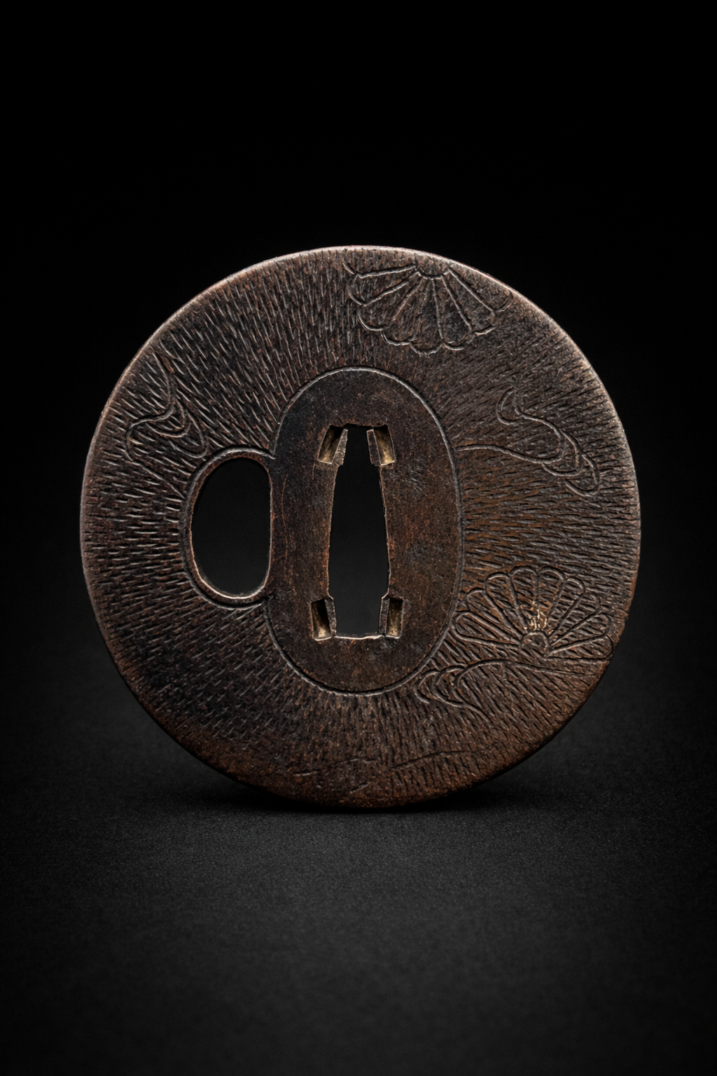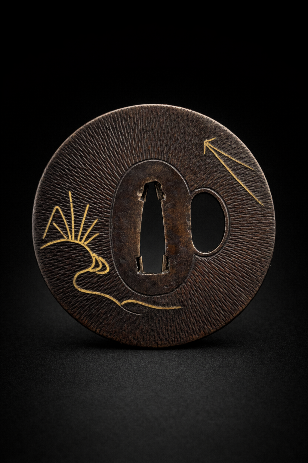 Tsuba japonaise en fer, de forme circulaire, à surface finement martelée et striée, animée d’un décor sobre rehaussé d’incrustations en laiton doré (nunome-zōgan). Le décor évoque un paysage stylisé : herbes souples, éventails et lignes obliques suggérant le vent ou la pluie, traités avec une grande économie de moyens. Le fer présente une belle patine brun foncé, profonde et homogène, soulignant la texture vibrante de la surface. Le seppa-dai ovale est bien dégagé, accompagné d’un hitsu-ana latéral. L’ensemble reflète l’esthétique raffinée et poétique des tsuba de la fin de l’époque Edo, où le décor suggéré prime sur la narration.