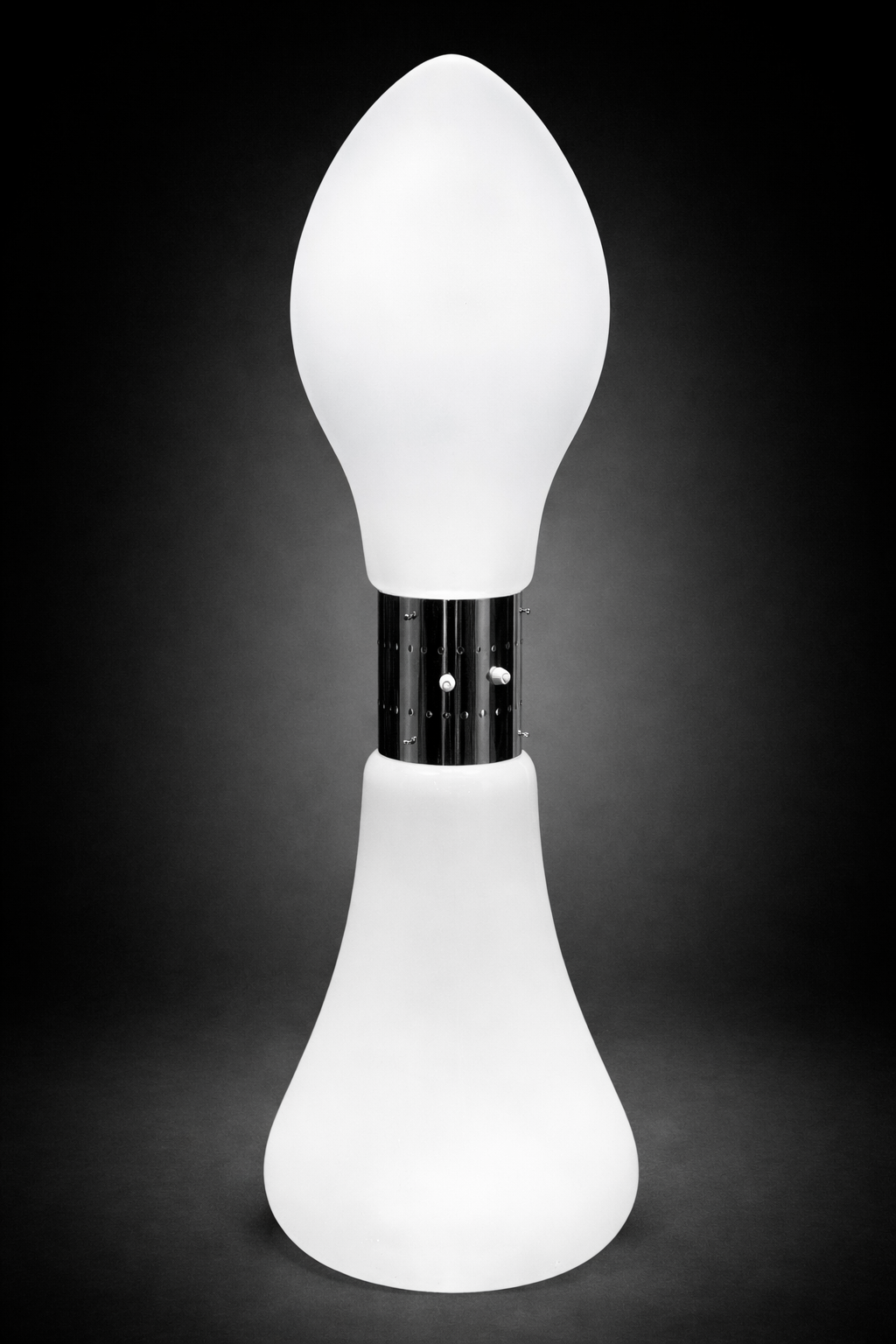 Lampadaire Birillo, modèle « Lipstick » a été conçue par Carlo Nason pour le fabricant Mazzega dans les années 1960 ou 1970. Il se caractérise par son style Pop Art ou « Space Age ». La composition repose sur un dialogue équilibré entre volumes simples et contrastes de matières. Elle est fabriquée en verre de Murano soufflé, L’abat-jour supérieur, de forme ovoïde allongée, est réalisé en verre opalin soufflé, diffusant une lumière douce et enveloppante. Sa surface parfaitement lisse et homogène témoigne du savoir-faire verrier propre aux ateliers liés à Mazzega, héritiers de la tradition de Murano tout en s’ouvrant à un langage résolument contemporain. Le fût central, en métal chromé poli miroir, constitue un élément à la fois structurel et décoratif. Il est rythmé par une série de perforations circulaires et de molettes de réglage, conférant à l’objet une dimension quasi mécanique, caractéristique du vocabulaire Space Age. Cette partie centrale agit comme un noyau technique apparent, mettant en valeur la fonctionnalité sans jamais rompre l’équilibre esthétique. La base, également en verre opalin blanc, adopte une forme évasée assurant stabilité et continuité visuelle avec l’abat-jour supérieur. L’ensemble se distingue par des proportions élégantes et une forte présence sculpturale, faisant de ce lampadaire un véritable objet d’architecture intérieure, au-delà de sa seule fonction d’éclairage.