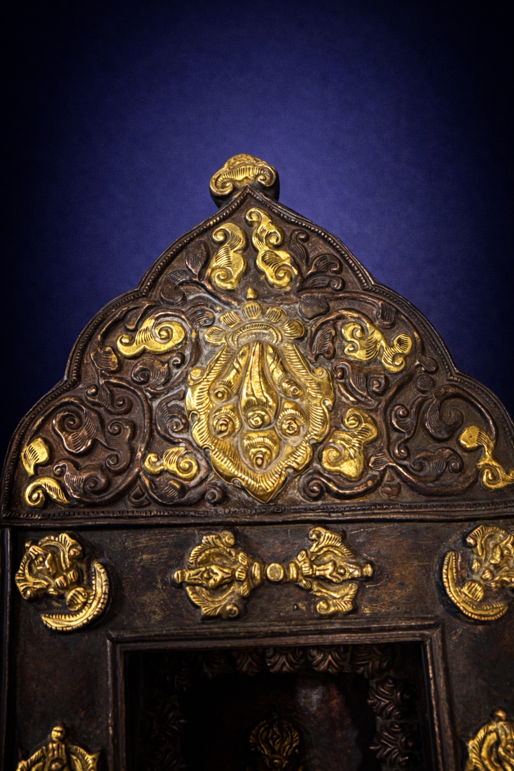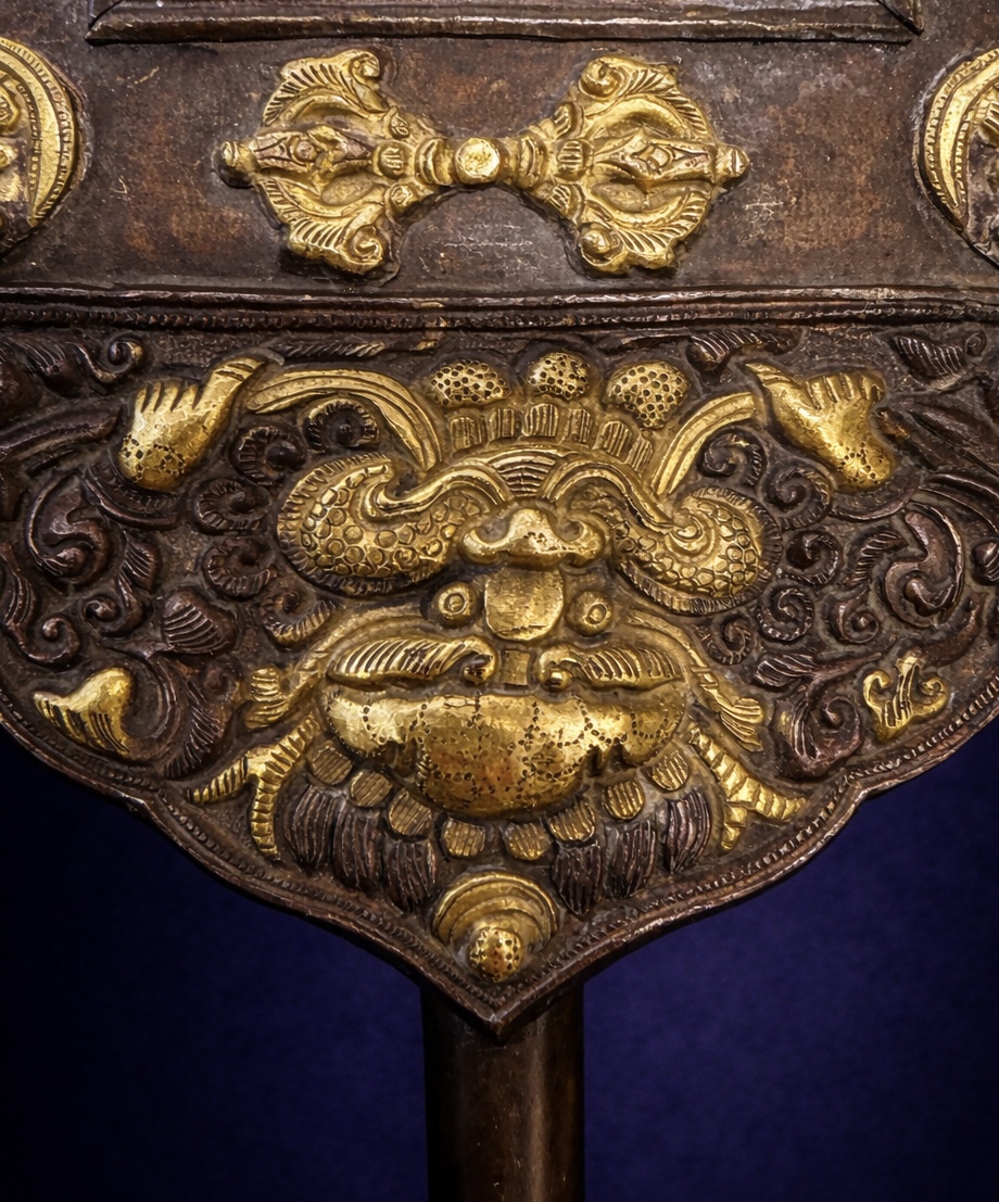 D’après la finesse des motifs repoussés et la patine du cuivre, cet ensemble peut être situé dans la seconde moitié du 19ème siècle (vers 1850-1900). Le style des masques de Kirtimukha et la précision des huit symboles auspicieux sont caractéristiques de la production tardive des ateliers de Derge (Tibet oriental) ou de l’art Newar (Népal) travaillant pour les grandes lignées monastiques. La présence des dorures d’origine et l’intégrité des structures démontables (souvent perdues ou soudées par le temps) suggèrent une conservation soignée, probablement au sein d’une collection privée ou d’un temple peu exposé.