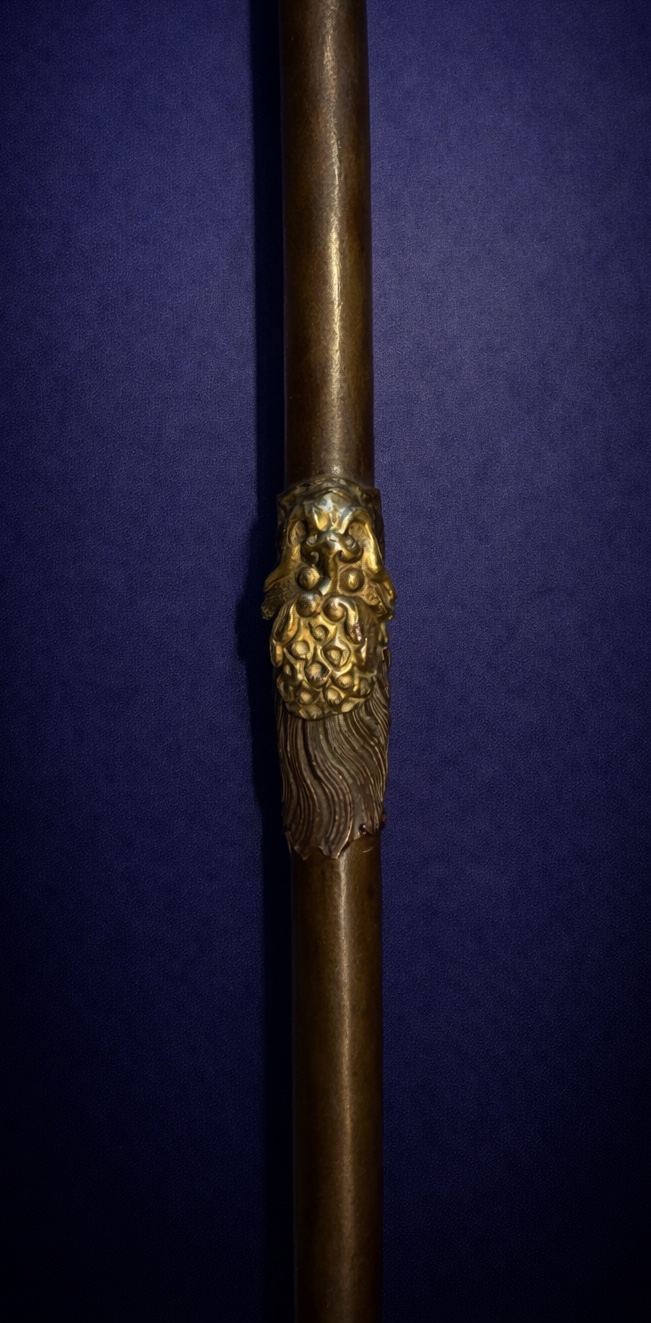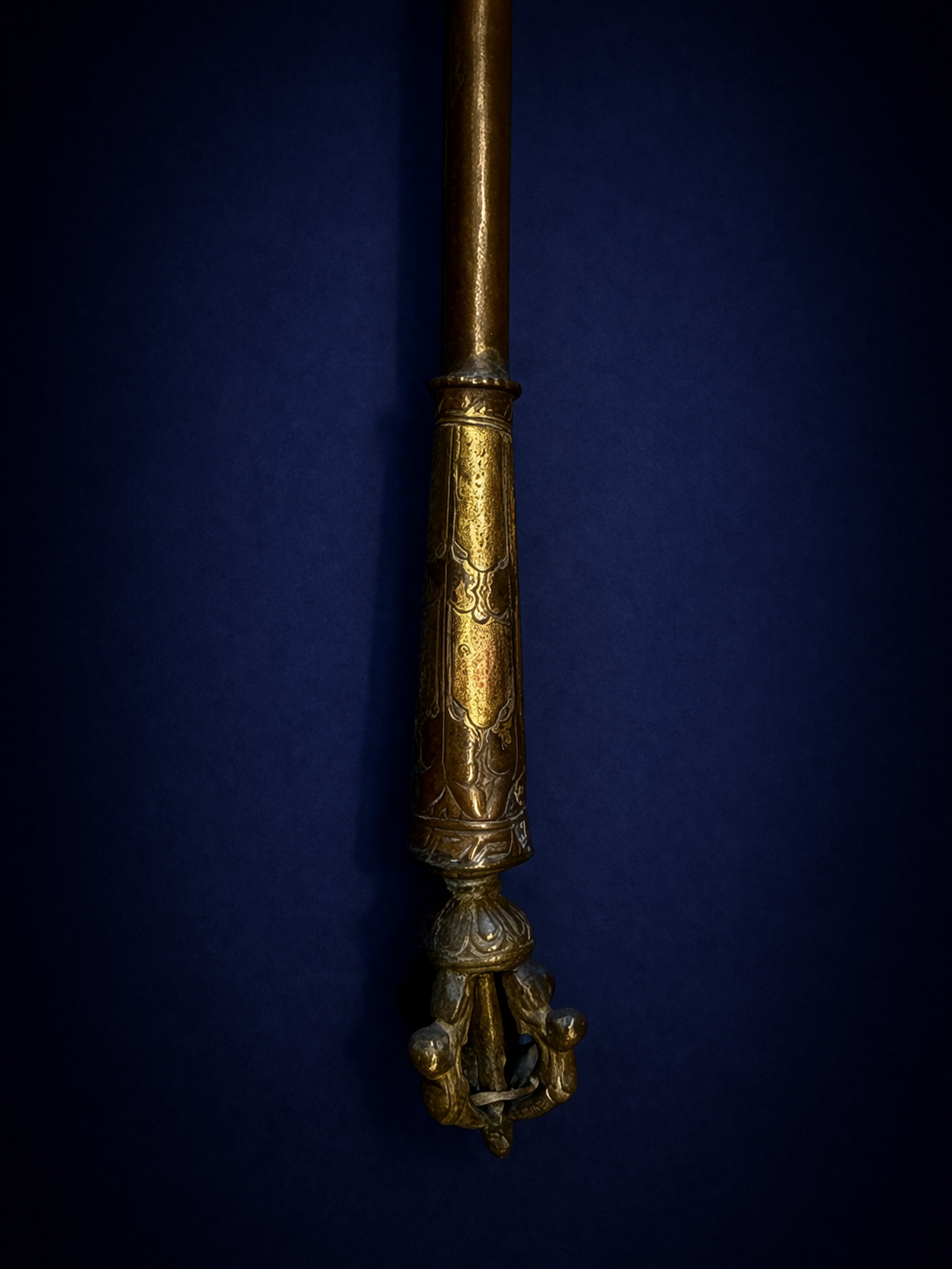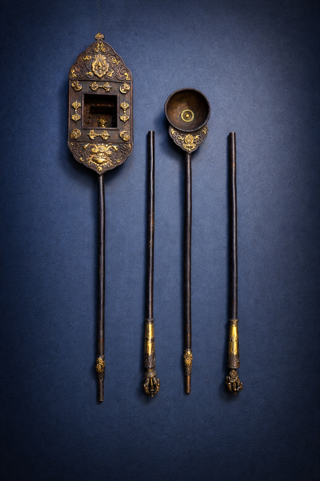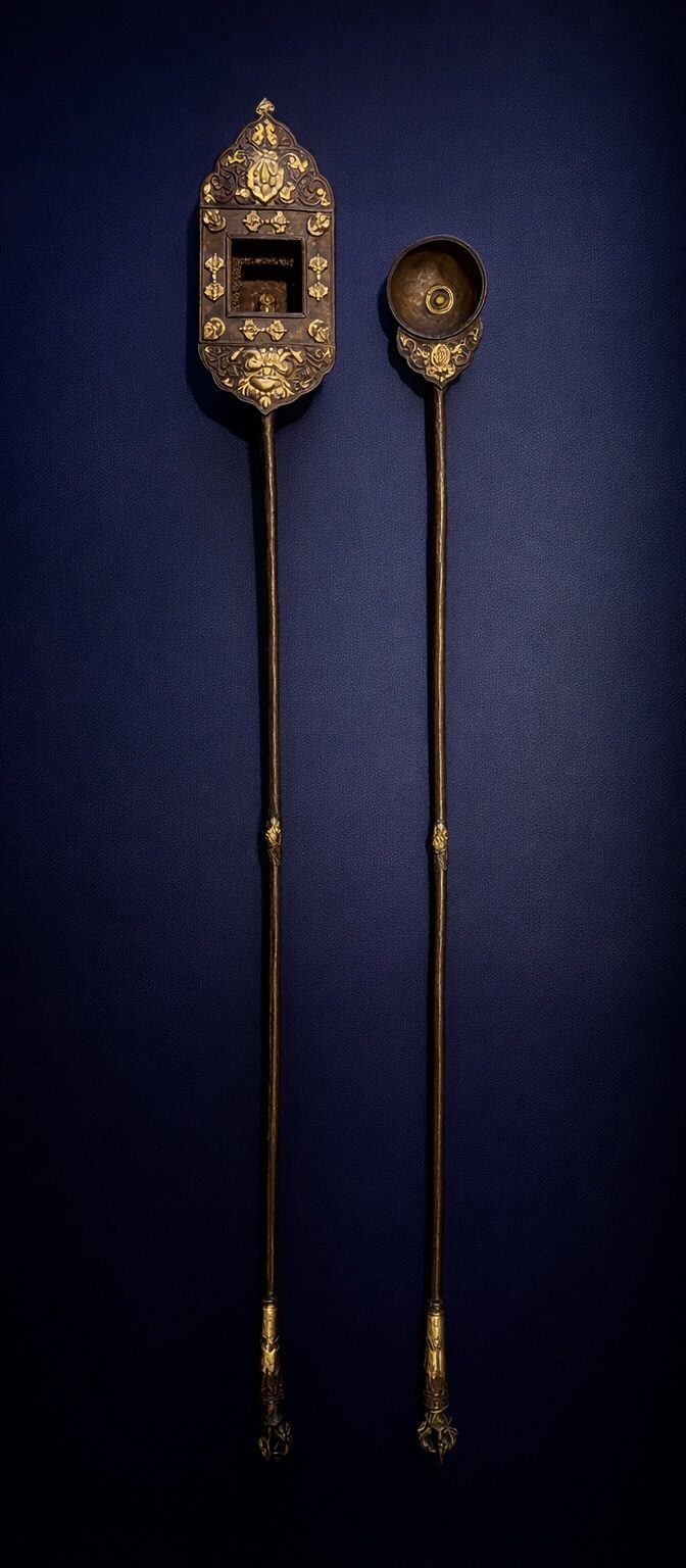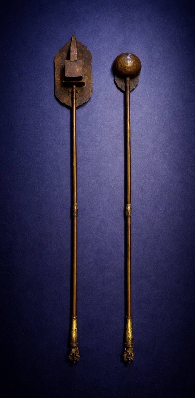 – L’Axe Immuable : Les longs manches se terminent par des Vajras (foudres-diamants), rappelant que celui qui manipule ces instruments doit rester ancré dans l’indestructible clarté de l’esprit.