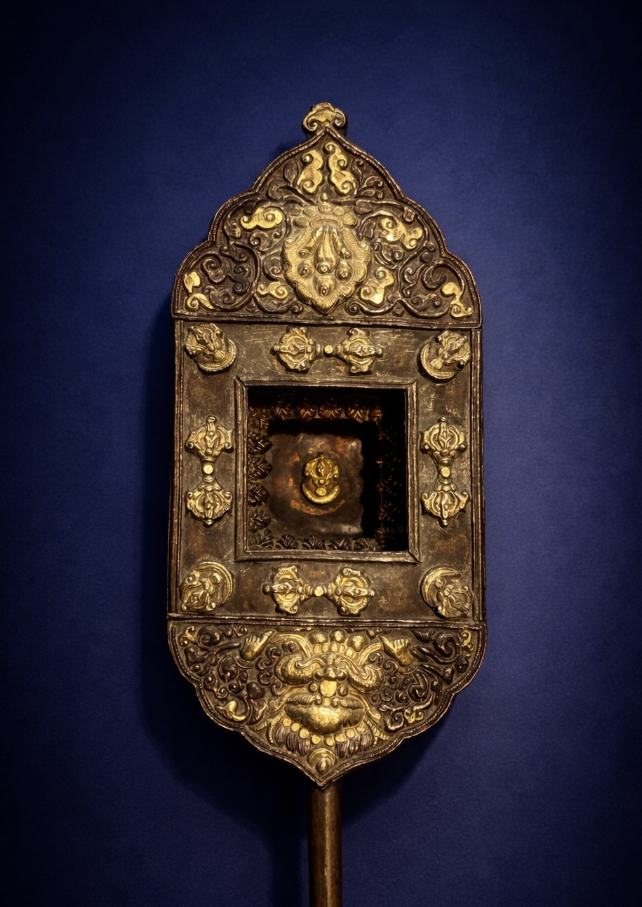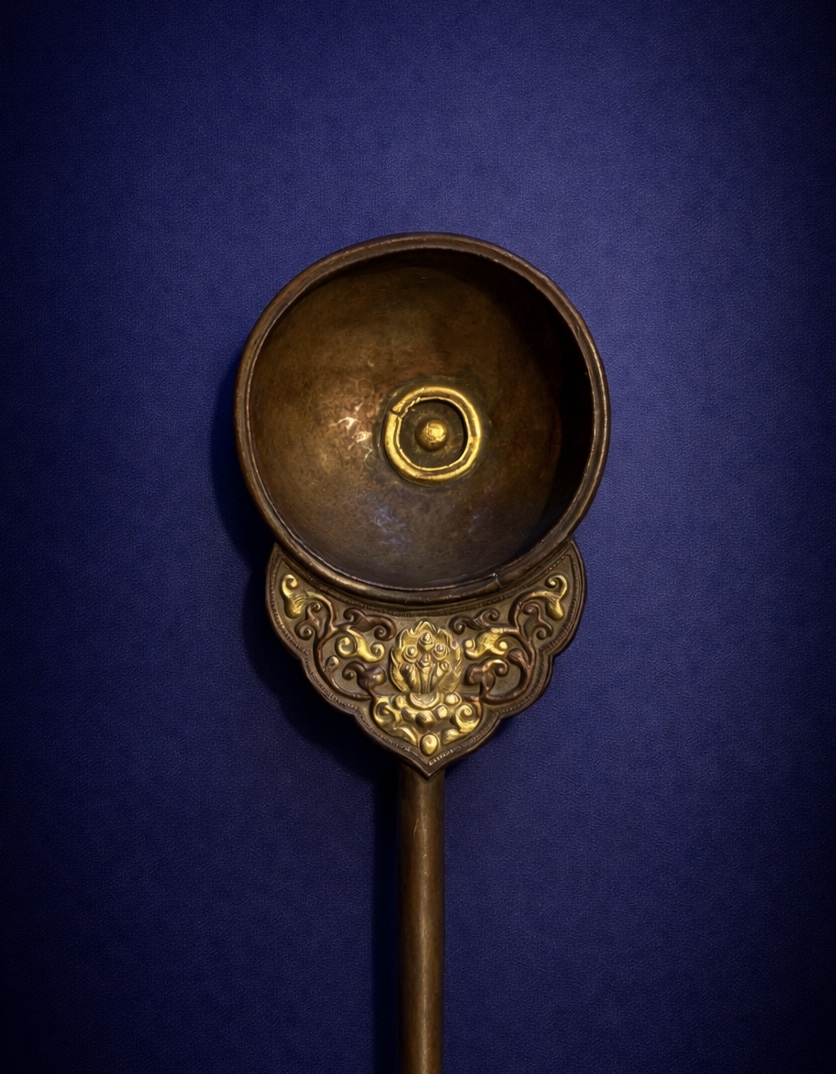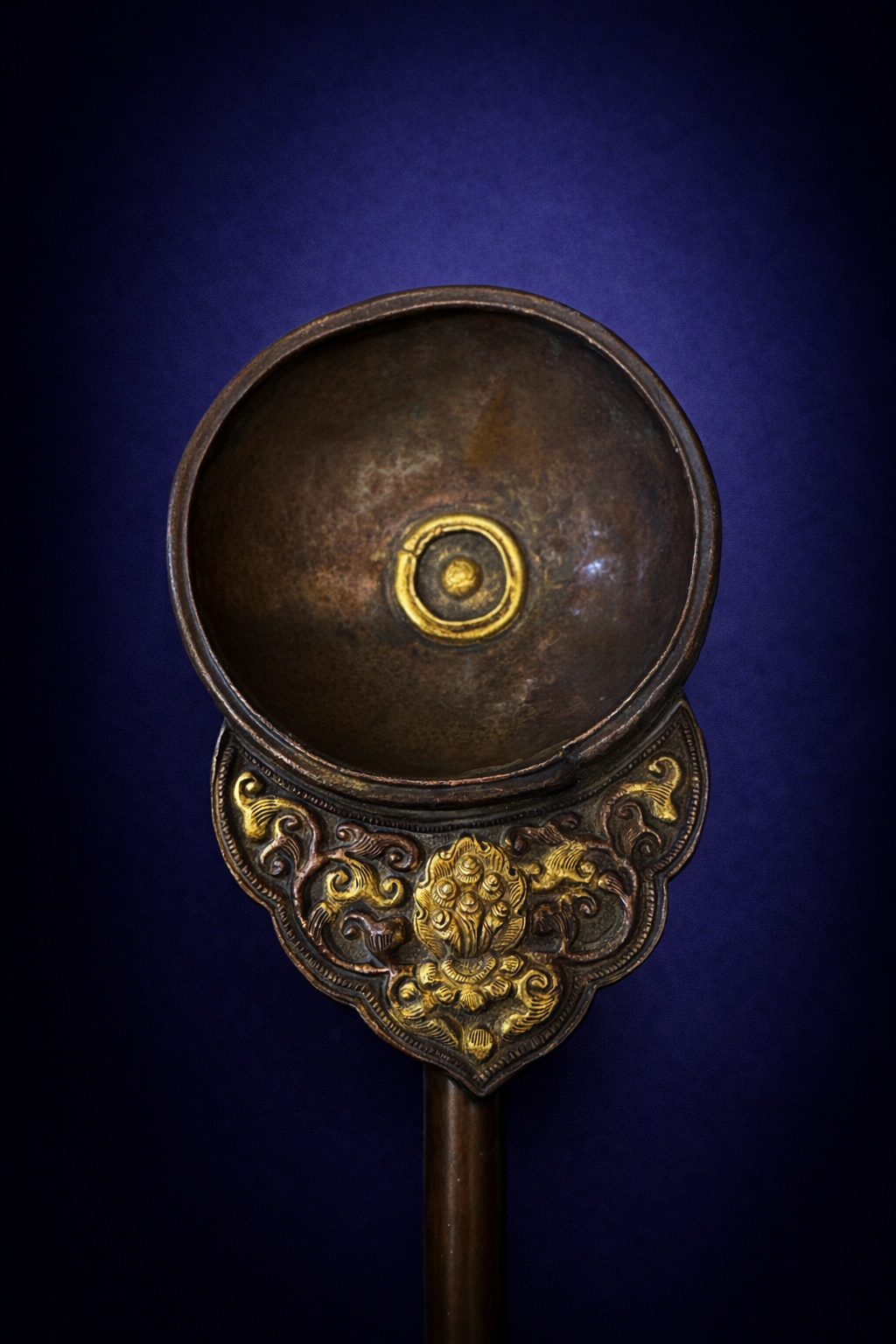 – Le Carré (Gang-luk) : La louche à réservoir rectangulaire, réceptacle du potentiel. Elle est ornée de masques de Kirtimukha (le Visage de Gloire) qui dévorent les impuretés, garantissant que seule l’intention la plus pure atteigne le foyer.