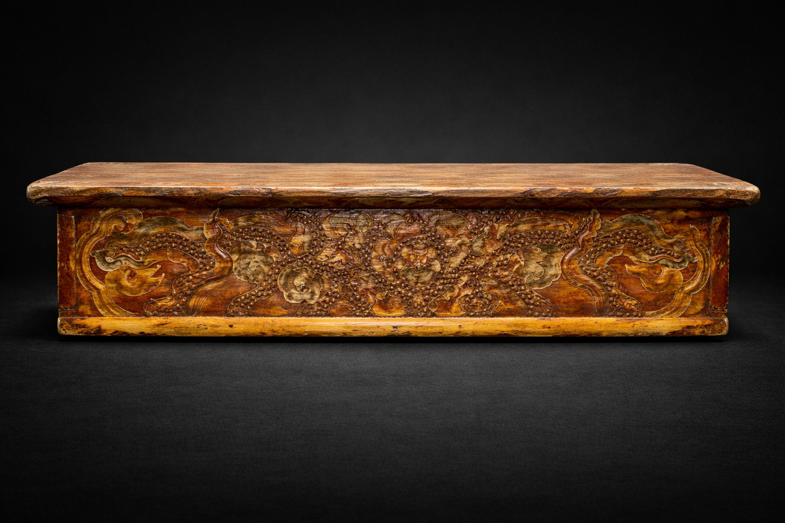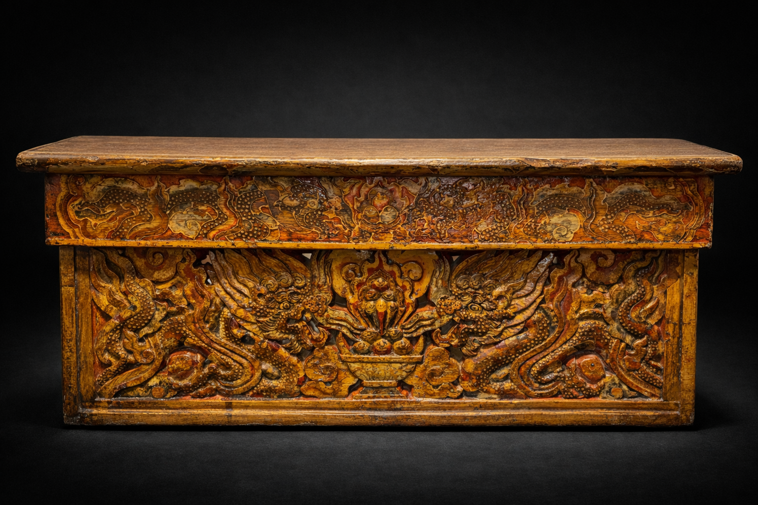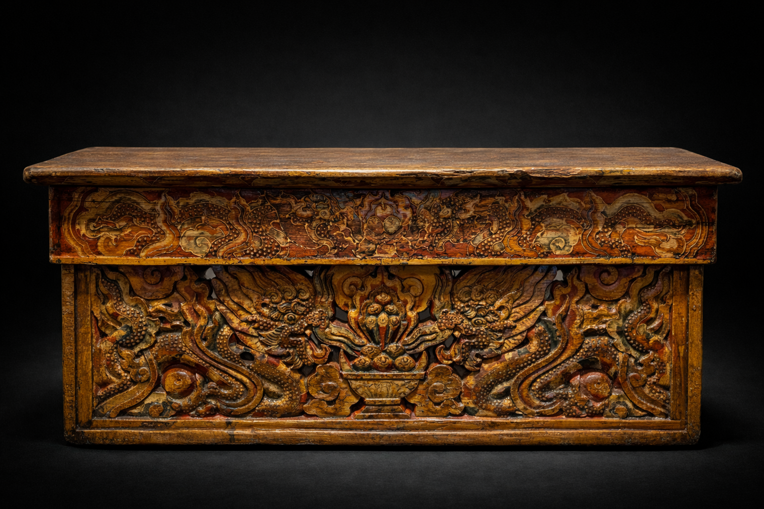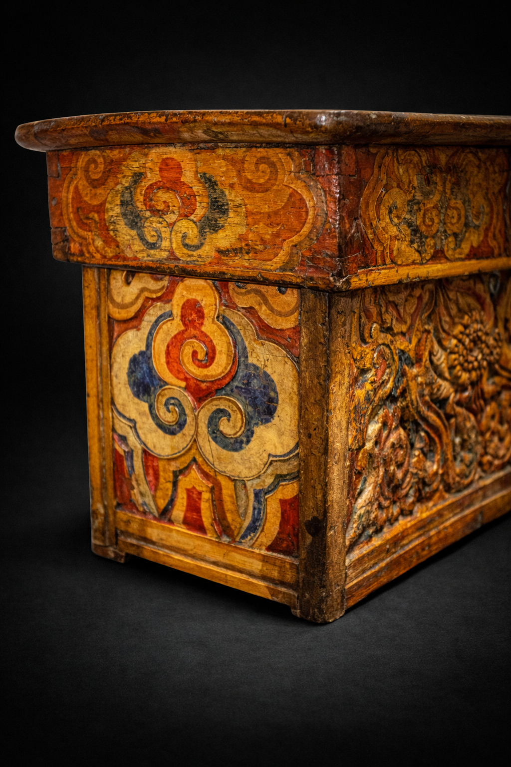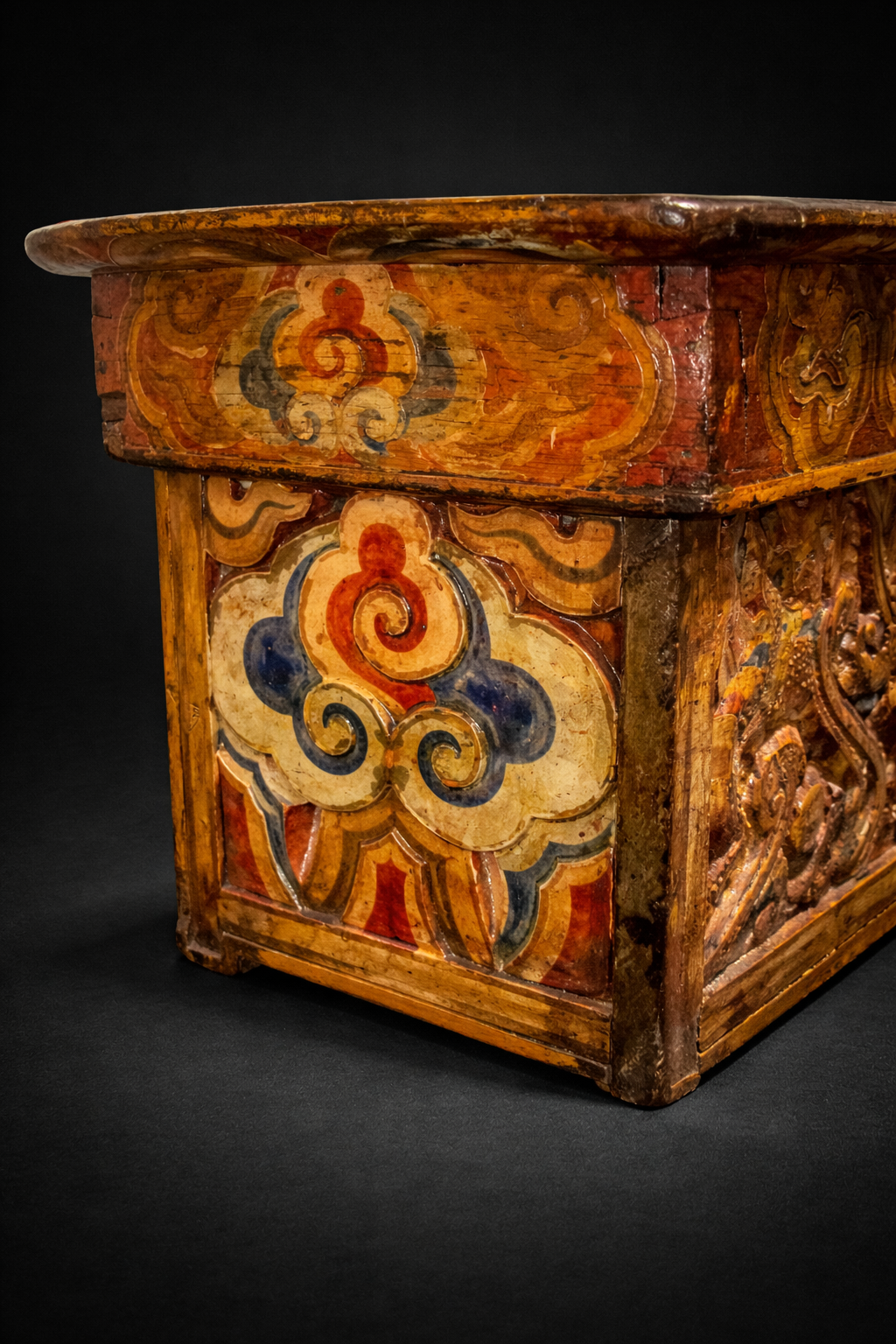 Le décor, exécuté en relief et rehaussé de pigments polychromes aujourd’hui largement patinés, est dominé par un registre iconographique profondément ancré dans le vocabulaire bouddhique tibétain. La façade principale est ornée de dragons affrontés, figures protectrices associées à la puissance cosmique, à la maîtrise des forces naturelles et à la sauvegarde de l’espace sacré. Ces créatures évoluent au milieu de nuées stylisées et de motifs d’auspices, symboles de bon augure et de circulation de l’énergie spirituelle. La composition frontale, strictement symétrique, est caractéristique des objets destinés à structurer un espace rituel face au pratiquant. Les côtés et les éléments repliables présentent un décor peint plus sobre mais cohérent, assurant une continuité symbolique même lorsque l’objet est fermé. Le plateau supérieur, volontairement dépourvu d’ornementation figurative, montre une usure ancienne et régulière, compatible avec le dépôt répété d’objets rituels : statuettes votives, lampes à beurre, textes sacrés ou offrandes sèches.